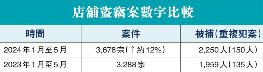 警方今年首5個月成功偵破六成店舖盜竊案,拘捕2,250人,被捕者的年齡層多為41歲至50歲,其次是51歲至60歲,男女比例各佔約一半。他們盜取的貨品價值只是十元八元,大部分是因個人原因而單獨犯案,他們並非沒有經濟能力,可能涉及個人情緒或壓力問題,導致出現失去自控力。這類犯案者很多時都是即興衝動犯案,部分人會本變加厲甚至偷竊成癮。但無論如何,將貨品帶離店舖而未有付款,都是犯法。