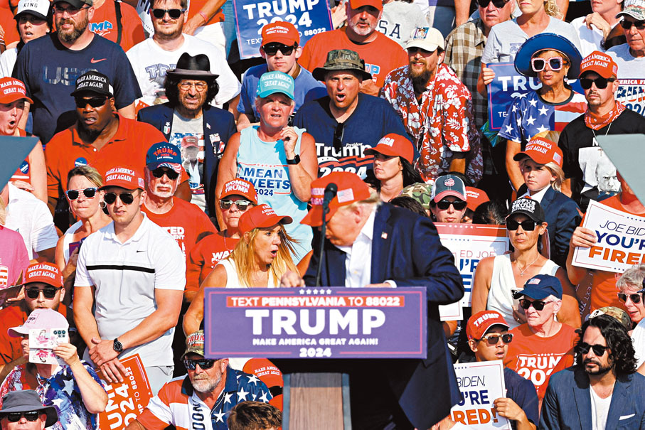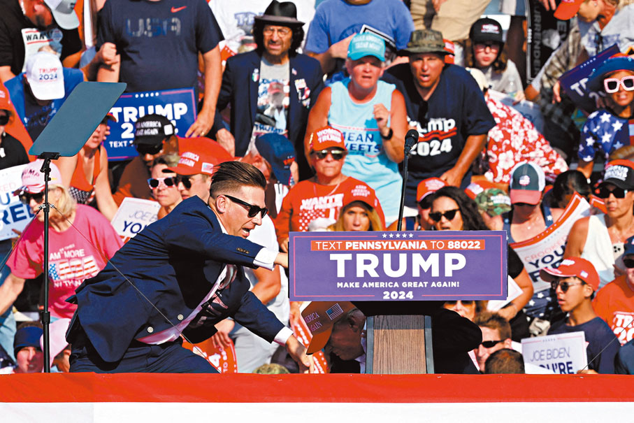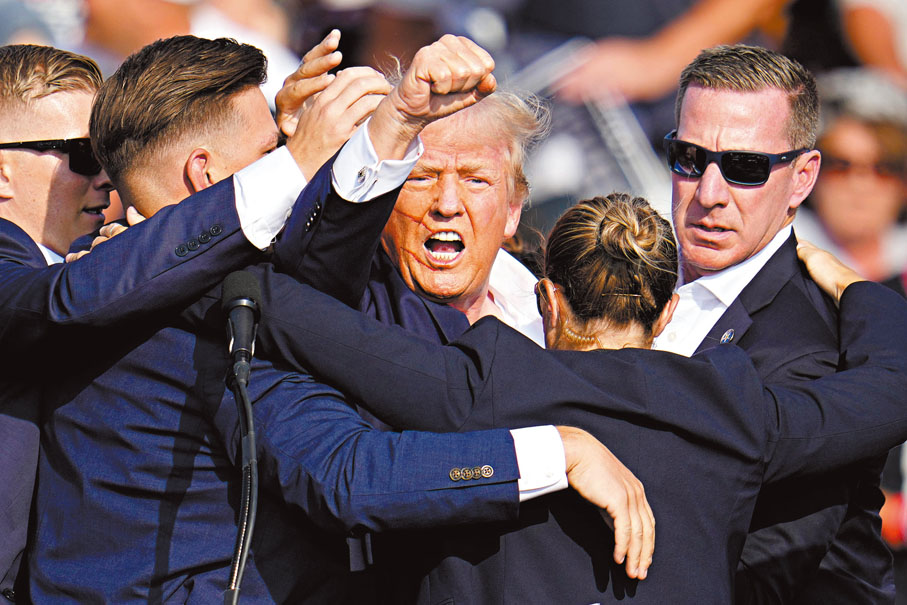 香港文匯報訊 美國前總統特朗普當地時間7月13日在賓夕法尼亞州競選集會上遇刺,右耳中彈受傷,現場觀眾則有一人死亡及兩人重傷,槍手被當場擊斃。多間美媒形容今次事件標誌美國政壇「黑暗一天」,揭開美國政治暴力新一頁,混亂的大選正走向兩極分化、暴力加劇的醜陋局面。