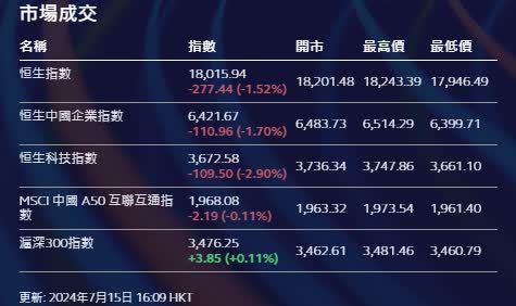 港股回吐,恒生指數18000點失而復得,指數午後跌幅一度擴大至近350點,低見17946點,收報18015點,跌277點,跌幅1.52%,主板成交額約911億元。
