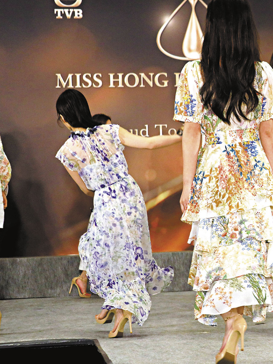 「翻版蔡潔」程姜月出場時不慎被絆倒,更險些跌落台,事後她解釋因台上地面不平所引致,又透露綵排時也有其他佳麗被絆倒。問到如要是真的跌落台會如何化解尷尬場面?她笑說:「我會即刻行返上去,唔想影響到其他人。」