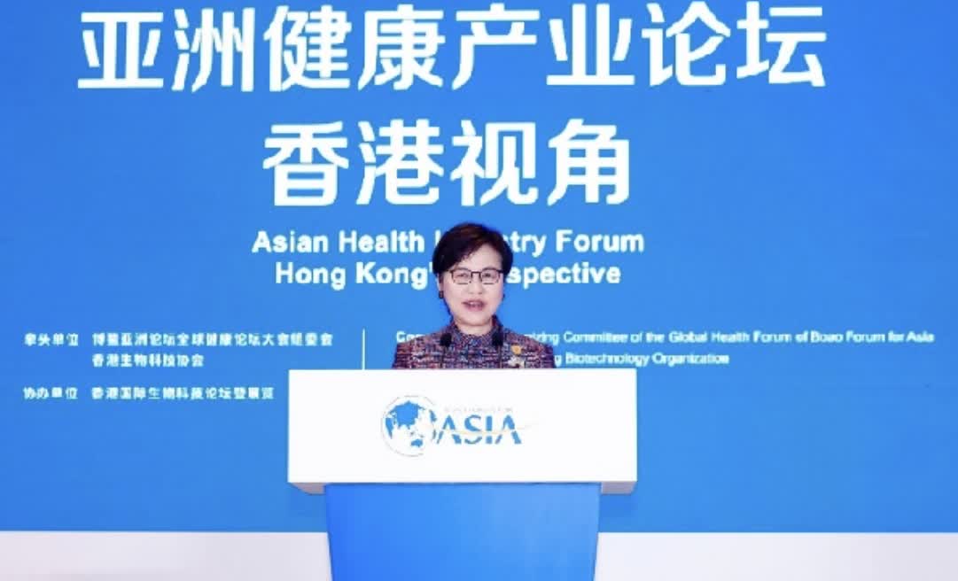 林鄭月娥為本次分論壇致開幕辭。她高度肯定了香港發展生命健康與生物科技產業的諸多優勢,並期望香港能在科技創新方面與大灣區及國際有更深層次的合作,共同應對地區性問題。
