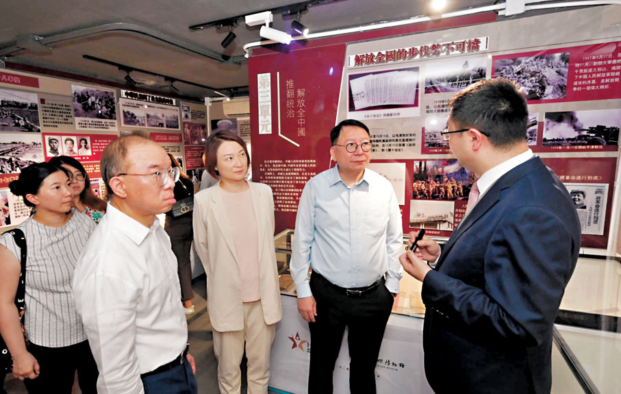 香港文匯報訊 為深入調研民間推廣愛國主義教育的工作,特區政府政務司司長陳國基聯同政制及內地事務局局長曾國衞、工作小組組長李慧琼,昨日下午實地考察兩個愛國主義教育基地,包括位於沙頭角的全港首間抗戰紀念館,以及位於新田永平村的香港愛國主義教育展廳。