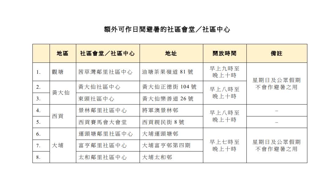 除以上臨時避暑中心外,部分社區會堂和社區中心亦會於開放時間內供市民作日間避暑之用: