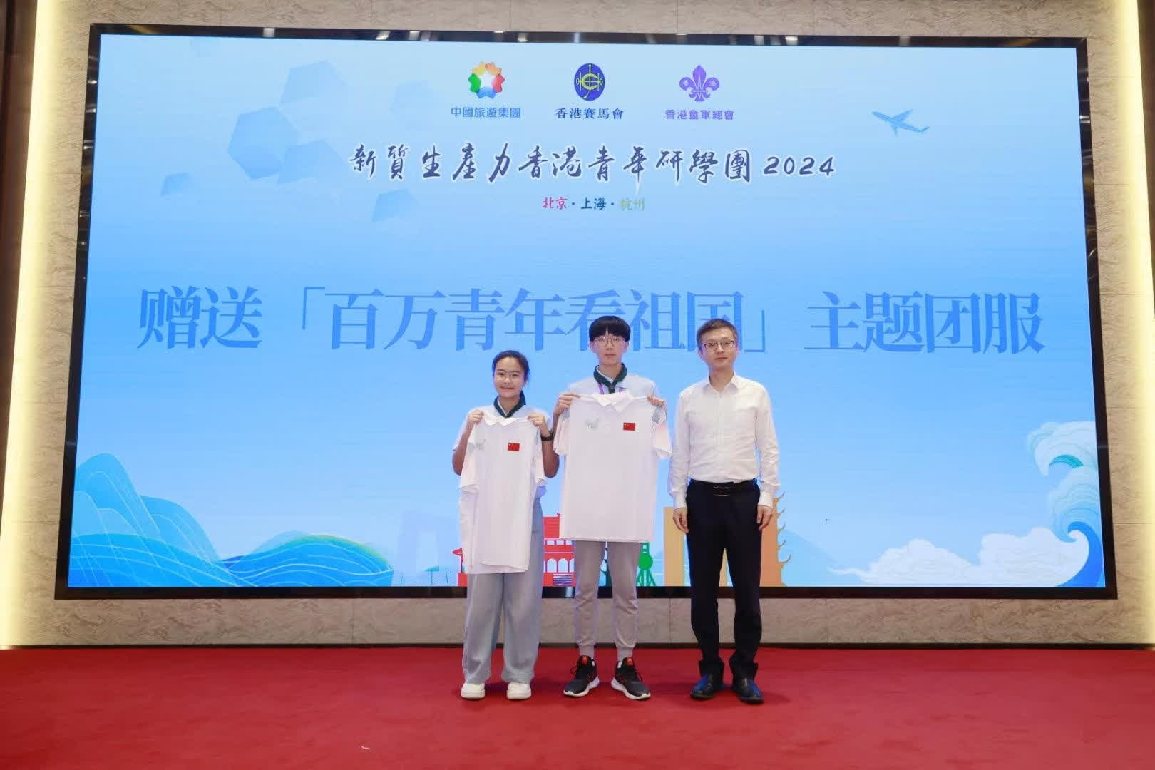 開營儀式現場,國務院港澳辦四局、文化和旅遊部港澳台辦公室、中聯辦青年工作部、國務院國資委國際合作局、中國旅遊集團、中旅旅行,以及贊助方香港賽馬會、協辦方香港童軍總會代表等出席。活動伊始,中旅旅行董事長鄭麗娟女士首先代表主辦方宣布開營儀式正式啟動,並對各位領導和嘉賓表示熱烈歡迎。她強調,中旅旅行致力於通過精心打造獨特的旅行體驗,讓青年們深入探索中國傳統文化的精髓,從而點燃他們對民族傳統的熱愛,激發傳承和弘揚中華文明的自覺擔當。中旅旅行將肩負使命,引領青年探索國家發展大勢,增強民族自豪感,希望通過這次研學之旅讓同學們深入理解新質生產力的內涵,在智能化時代探索科技創新,激發創新思維,培養實踐能力,為推動社會進步貢獻青年智慧。中旅旅行承諾提供最優研學體驗,讓同學們深入了解科技創新與歷史文化。與此同時,感謝各方支持,期待同學們收穫知識、友誼與成長,為實現中華民族偉大復興的中國夢貢獻青春力量。隨後,香港賽馬會內地事務部主管陳岳鵬表示,「作為一家愛國愛港的機構,香港賽馬會一直致力於推動兩地青年的交流與創新發展,讓他們能夠開拓視野,探索新技術與新產業,為香港和祖國的未來發展貢獻力量。作為此次研學團的贊助方,我們非常高興能夠參與其中。我們相信,這次研學團將為參與的香港青年帶來全新的洞見和啟迪,讓他們對國家創新發展有更深入的認知和體驗。我們衷心希望這個活動能夠取得圓滿成功,為香港和內地的交流合作注入新的動力。」最後,青年團員代表分享對此次研學活動的期待與展望,並向主辦方及贊助方贈送紀念品。中央政府駐港聯絡辦領導向團員代表贈送「百萬青年看祖國」主題團服。