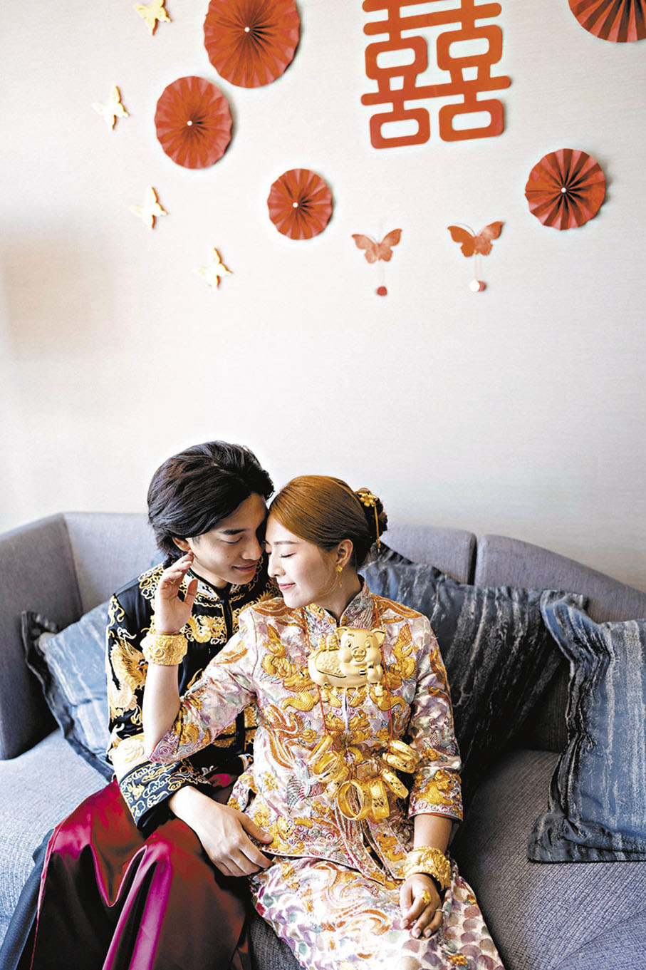 香港文匯報訊(記者 阿祖)曾參選港姐的李亦喬(Monnie)昨日與圈外男友招先生於酒店舉行婚宴。Monnie 「行頭」十足, 以一身「褂皇」現身,佩戴9對龍鳳鈪寓意長長久久,當中更包括兩對「流星錘」金鈪, 且有金豬牌、花鏈等,合共16件 「六式金」,寓意早生貴子。