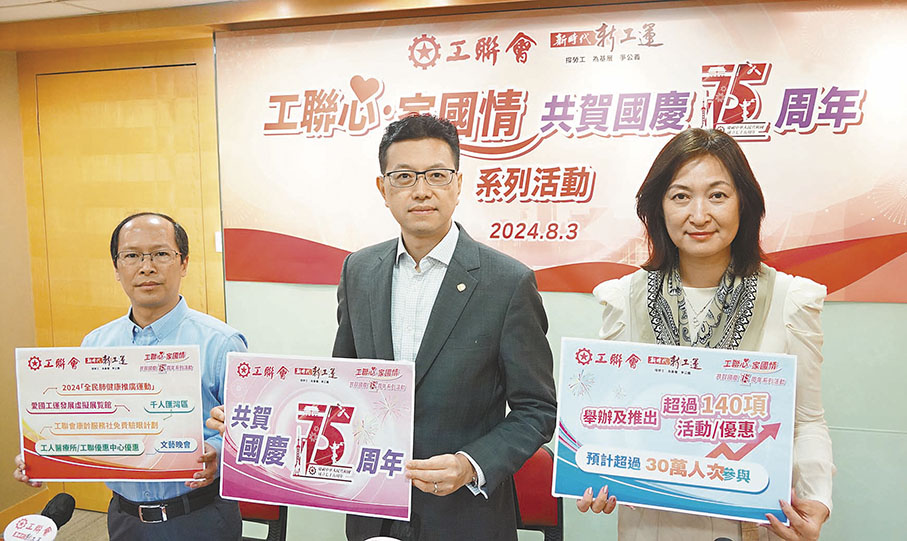 在「共賀國慶」方面,程岸麗介紹,今年適逢工聯會工人俱樂部成立60周年,工聯會將舉行酒會及文藝晚會慶祝。10月1日國慶節當天,工聯會將在大埔舉行「國慶長跑2024」,預計約600人參與,又會推出一系列國慶會員優惠活動,包括與不同企業合作,提供「幻彩詠香江」海上自助餐尊尚折扣、巴士折扣、機票預訂優惠等。