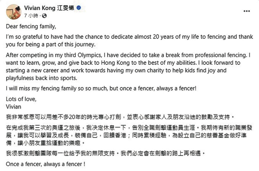 江旻憓在巴黎奧運摘下個人首面奧運金牌後於上周四返港,其間曾到中大醫學院及兒時學劍擊的劍會探訪並分享金牌喜悅,不過昨日她突然在社交網站以中英雙語發文,宣布自己告別全職劍擊運動員生涯。江旻憓表示非常感恩可以用差不多20年時光專心打劍,並衷心感謝家人和朋友沿途的支持和鼓勵,期待事業有新發展並為設立慈善基金做好準備:「我非常感恩可以用差不多20年時光專心打劍,並衷心感謝家人和朋友沿途的支持和鼓勵。在完成我第三次的奧運之旅後,我決定休息一下,告別全職劍擊運動員生涯。我期待有新的職業發展,讓我可以學習和成長,裝備自己,回饋香港;同時累積經驗,為設立自己的慈善基金做好準備,讓小朋友重拾運動的樂趣。我很感激劍擊團隊每一位給予我的無限支持。我們必定在劍擊的路上再相遇。Once a fencer,always a fencer!(一日劍手,終生劍手)」