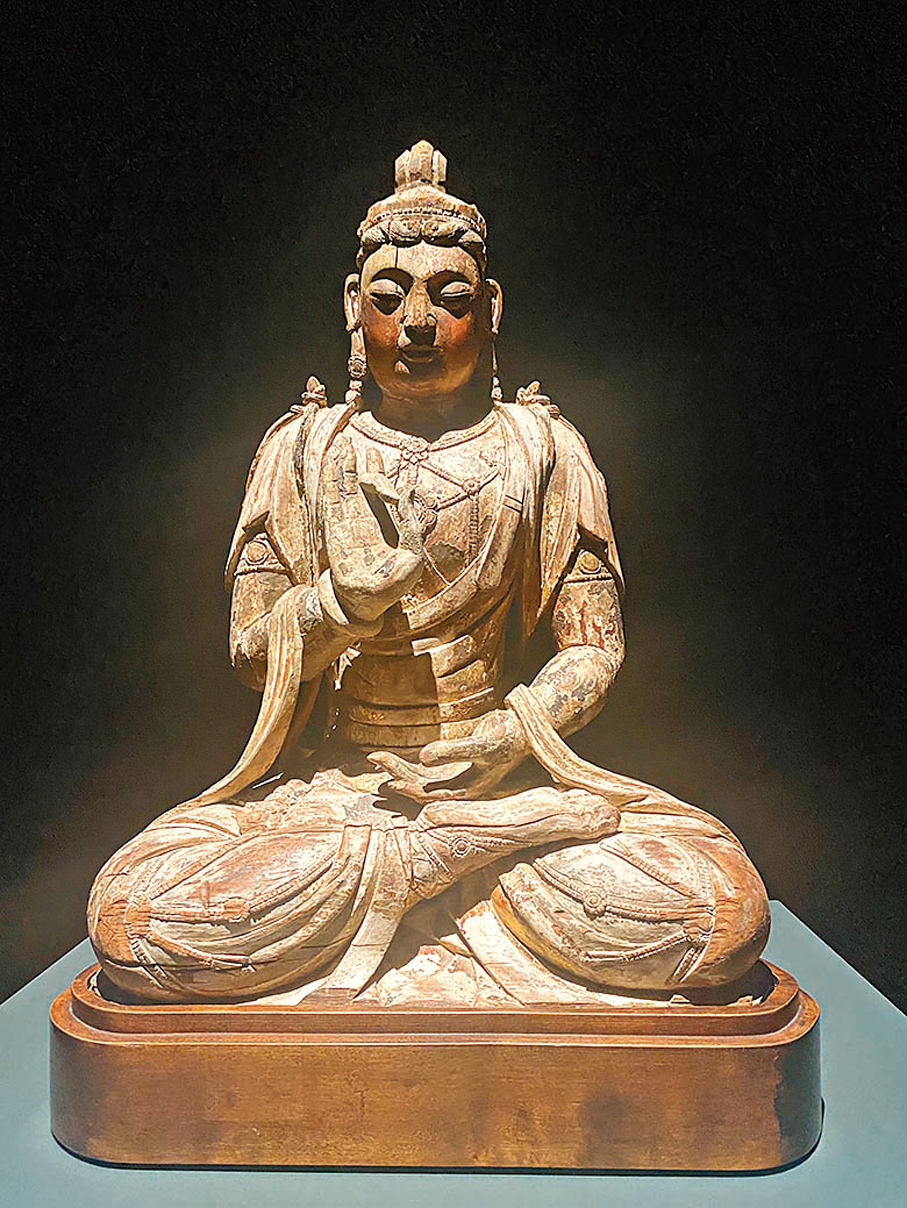地下樓層的Grotto及Pantheon藝廊展出佛教造像傑作「菩提:佛教藝術萃珍」,多尊大型佛像在這個充滿禪意的空間展出,牆上展板則以時間為軸追溯佛教藝術發展軌跡。天花上特意開了一些圓孔,以讓自然光能投射到展館中,為參展增加氛圍。展覽中最巨大的一尊佛像為高近三米的明代銅釋迦牟尼佛坐像,由明代宮廷重金選聘頂尖銅匠打造。毗鄰的另一展出精品,為宋代木雕加彩觀世音菩薩坐像。此像歷經千年,礦彩猶存,難能可貴。