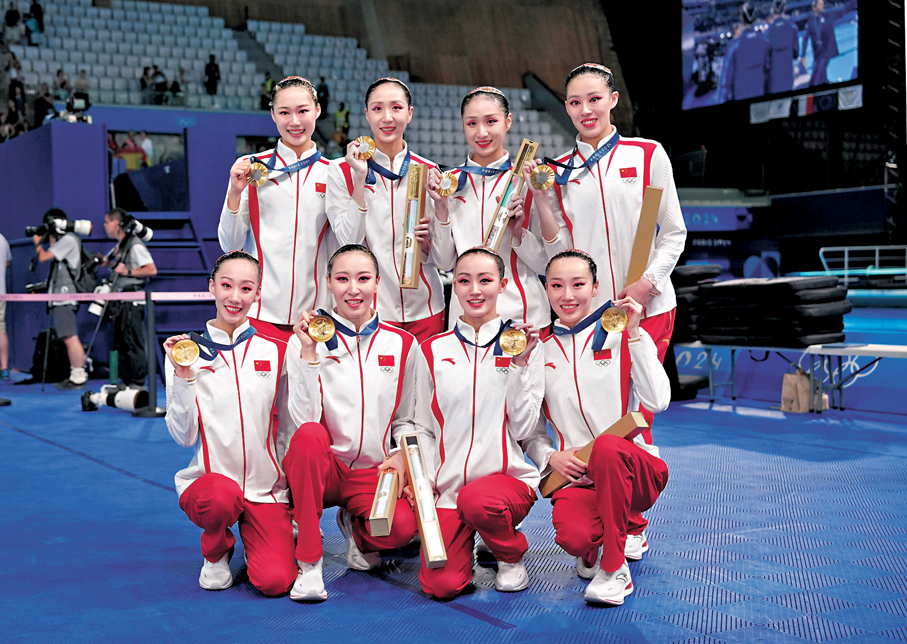 ◆巴黎時間8月7日,冠軍中國隊在頒獎儀式後合影。當日,巴黎奧運會花樣游泳集體項目的最後一項比賽集體技巧自選在巴黎奧林匹克水上運動中心舉行。中國隊奪得花樣游泳集體項目冠軍。 新華社
