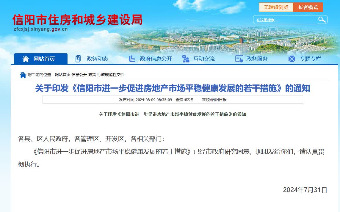 信陽市住房和城鄉建設局今日(9日)發布關於印發《信陽市進一步促進房地產市場平穩健康發展的若干措施》的通知,其中明確,收購等量的已建成未出售商品房轉化為保障性住房;推行購房契稅補貼,中心城區購買新建商品房或二手房契稅100%獎補;首套住房商業性個人住房貸款最低首付比例調整至15%。