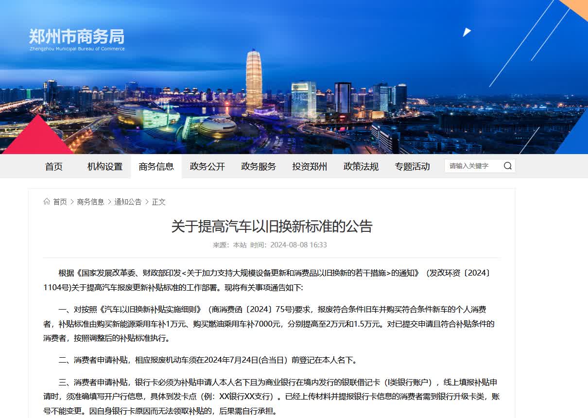 鄭州市商務局8日發布關於提高汽車以舊換新標準的公告。