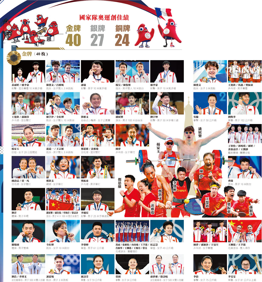 香港文匯報訊 據新華社報道,11日,巴黎奧運會舉重女子81公斤以上級比賽中,國家隊選手李雯雯奪得金牌,這是國家隊在巴黎奧運會中奪得的第40金,加上中國代表團奪得的27銀、24銅,國家隊獎牌總數達91塊,創下境外參加奧運會最好成績。此前一天,國乒女團兵不血刃拿下奧運五連冠,為「王者之師」在巴黎實現包攬,也為中國體育代表團斬落夏季奧運會第300金。