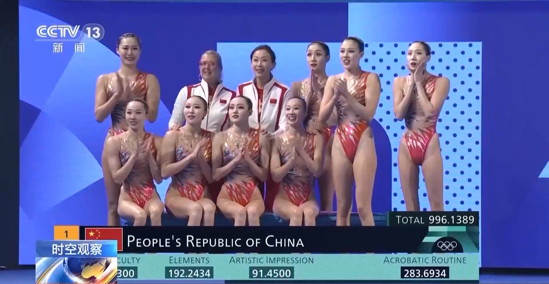 996.1389分!中國花游姑娘們以三場比賽穩居第一的優異表現,贏得了中國花游在奧運會上奪得的首枚金牌。
