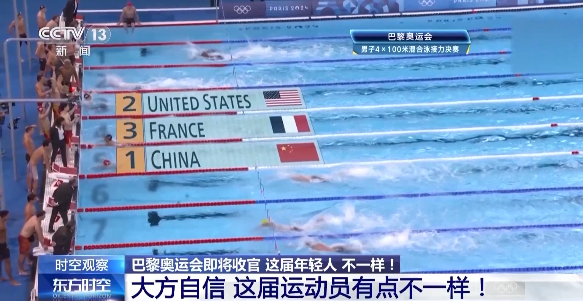 巴黎奧運會游泳賽場最後一個比賽日,中國隊放了個大招。男子4×100米混合泳接力決賽上,中國隊力壓該項目40年「霸主」美國隊,以3分27秒46的成績奪冠。