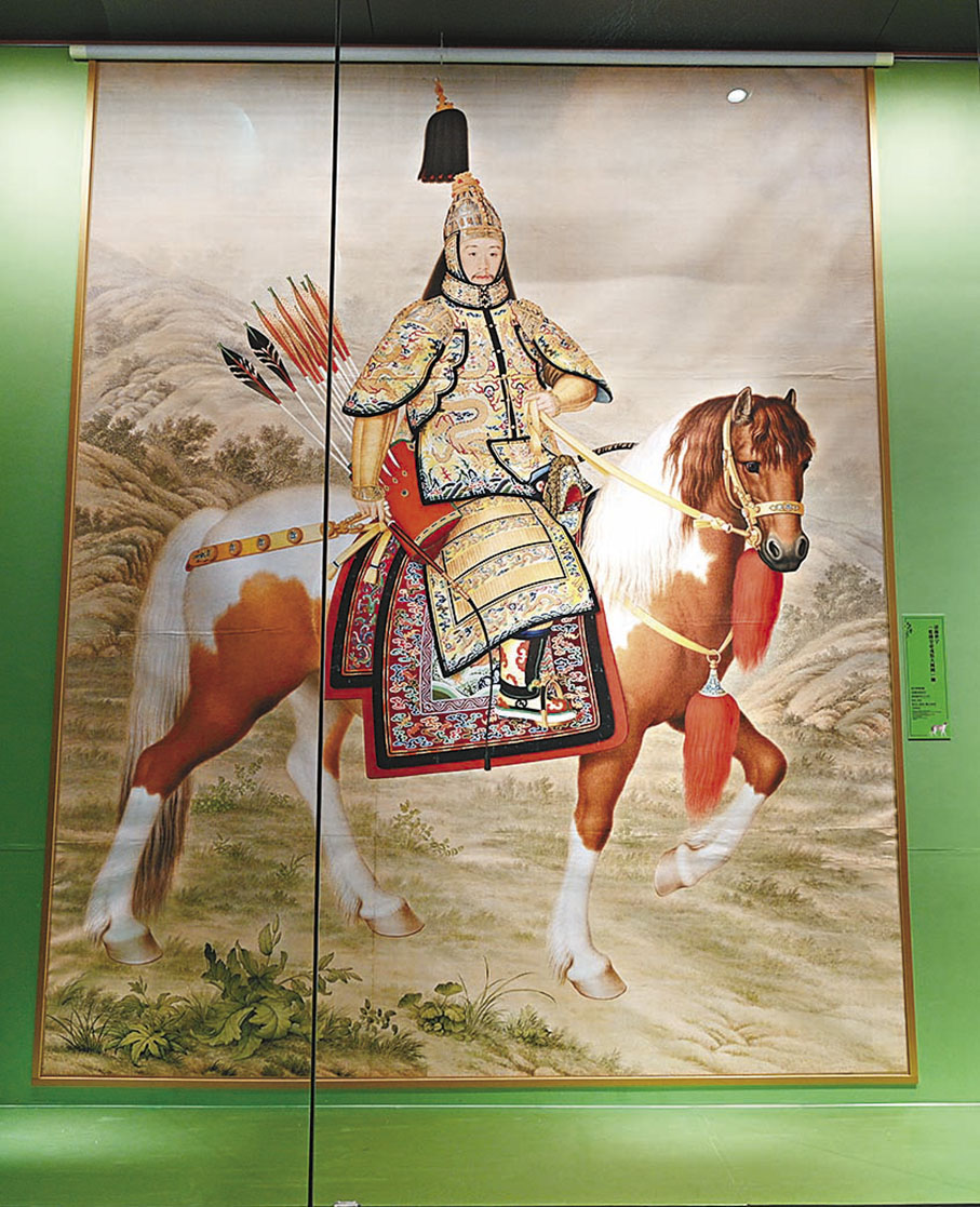 《乾隆皇帝戎裝大閱圖》也在此次展覽中展出,該作品所繪內容為弘曆29歲在京郊南苑舉行閱兵時的戎裝像,是郎世寧的盛年佳作。此圖近景的草葉近乎西方的靜物寫生,只有遠山的結構保留了清宮寫實山水的一些特點。