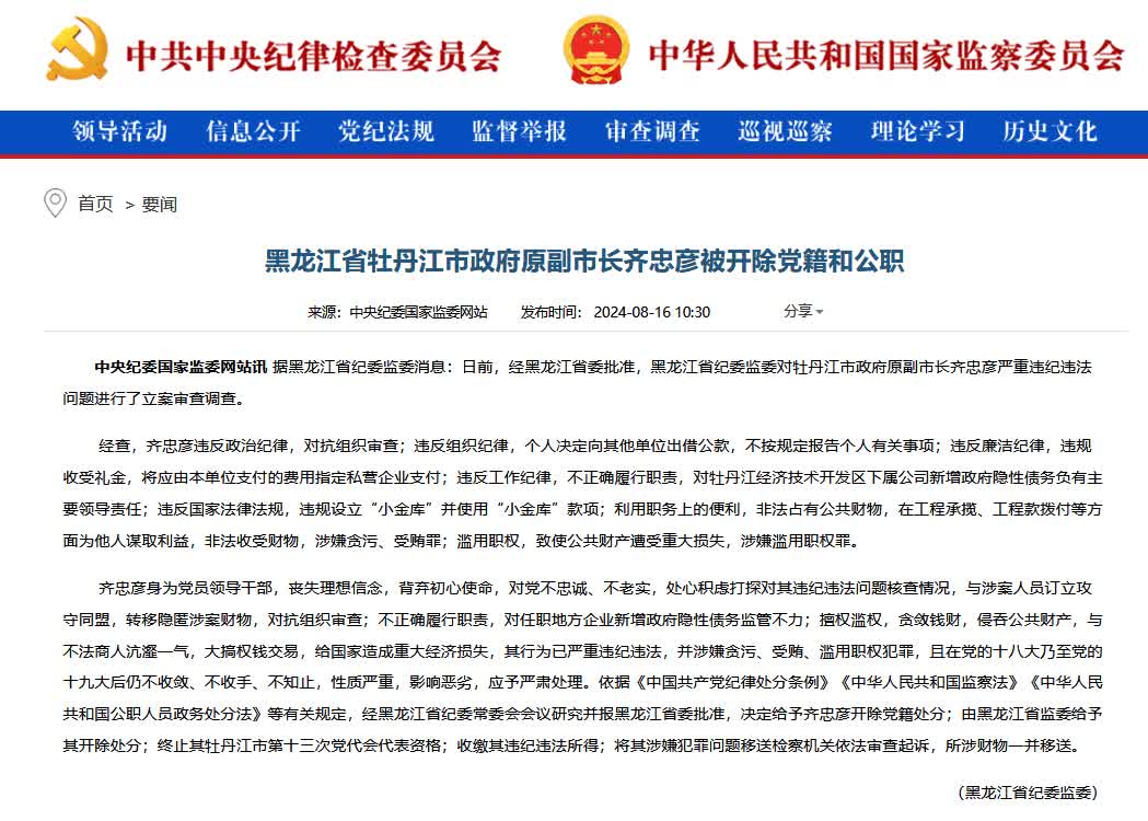 據黑龍江省紀委監委消息:日前,經黑龍江省委批准,黑龍江省紀委監委對牡丹江市政府原副市長齊忠彥嚴重違紀違法問題進行了立案審查調查。