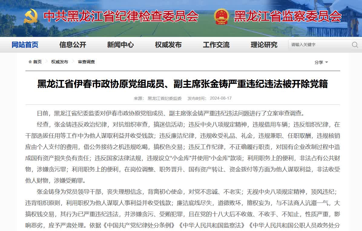 據黑龍江省紀委監委發布消息,日前,黑龍江省紀委監委對伊春市政協原黨組成員、副主席張金鑄嚴重違紀違法問題進行了立案審查調查。