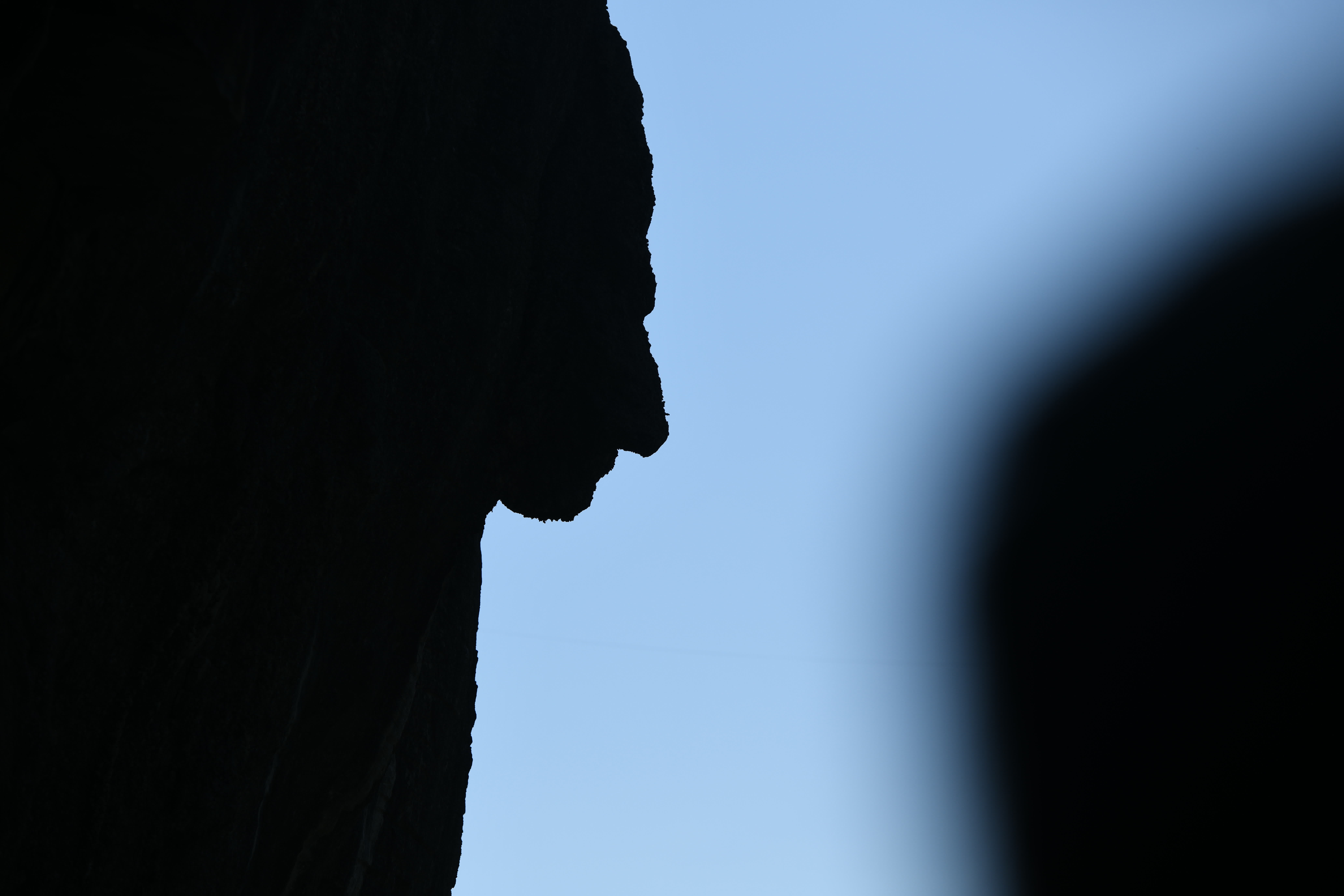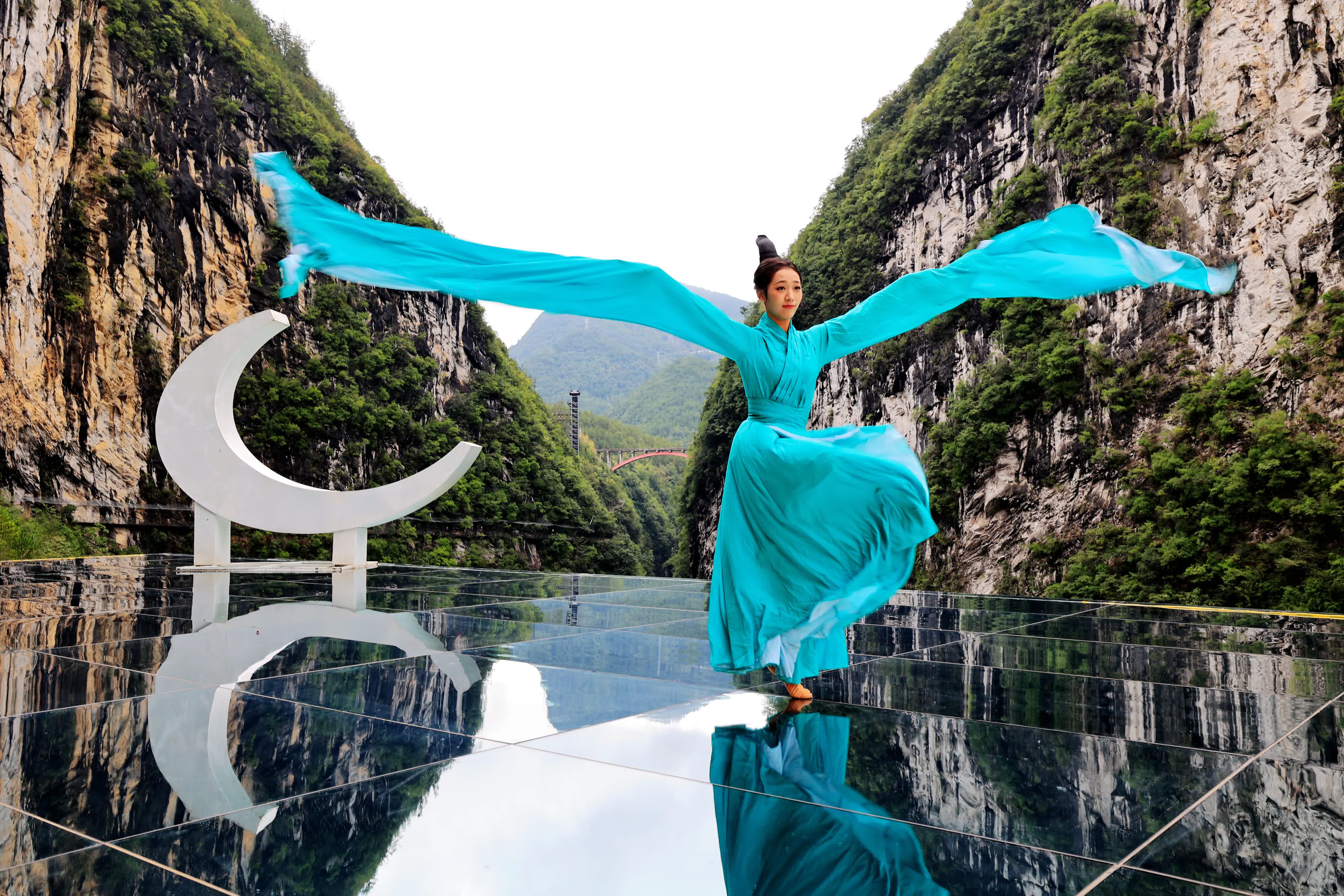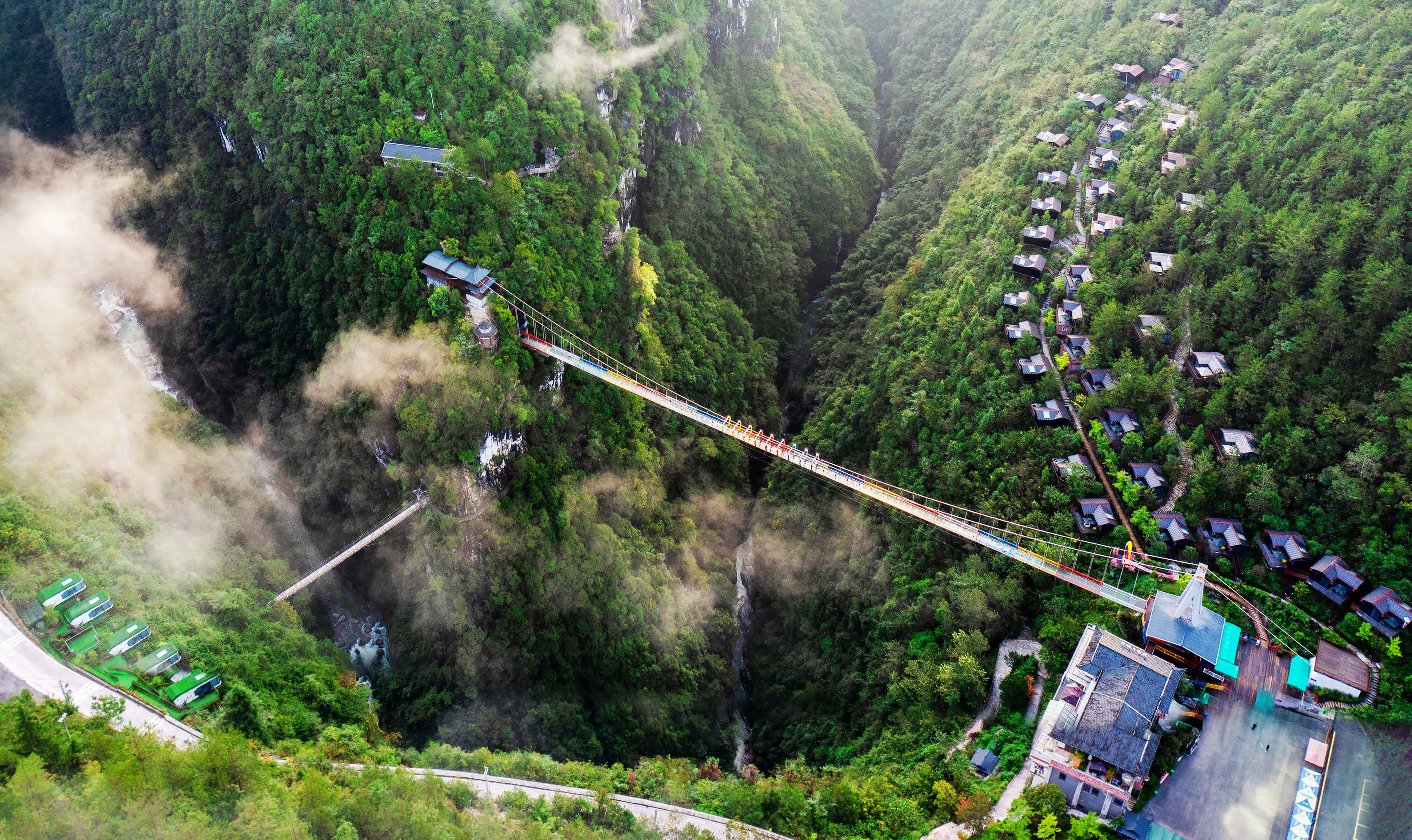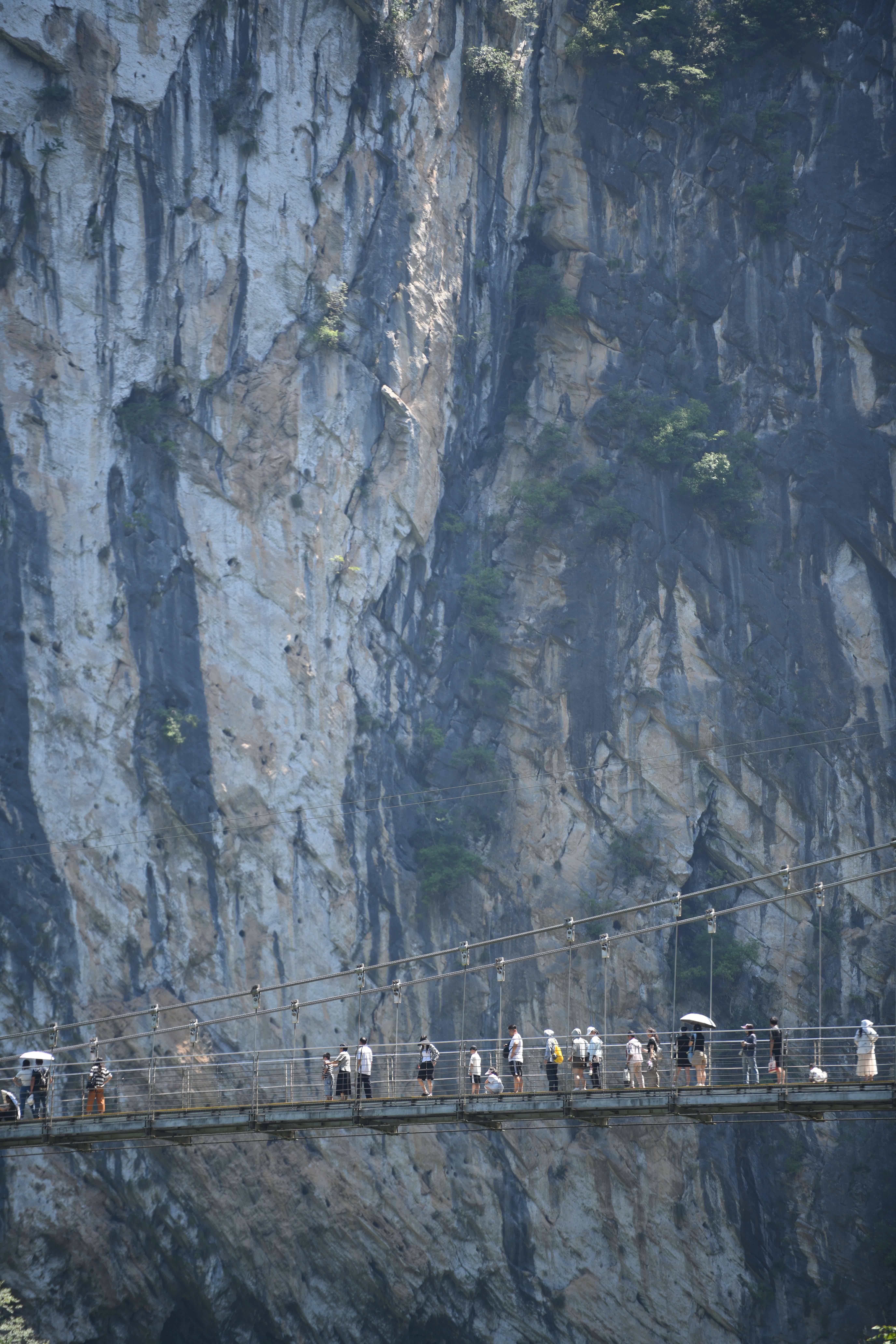 進入景區,最先打卡的是「雲之端」玻璃橋,此處號稱全國首座峽谷9D玻璃懸索橋,總長度268米、寬度3.2米,距離河谷的相對高度約200米。行走橋上,如置身彩雲間。穿過雲之端玻璃橋,就登上了全長約2公里、距谷底一兩百米的懸空棧道。棧道開鑿於懸崖之上,狹窄處需側身而過。途中,能見到崖壁上「長」出一張仿佛古人側臉的石頭,這就是「地心山神」,頗具神奇。