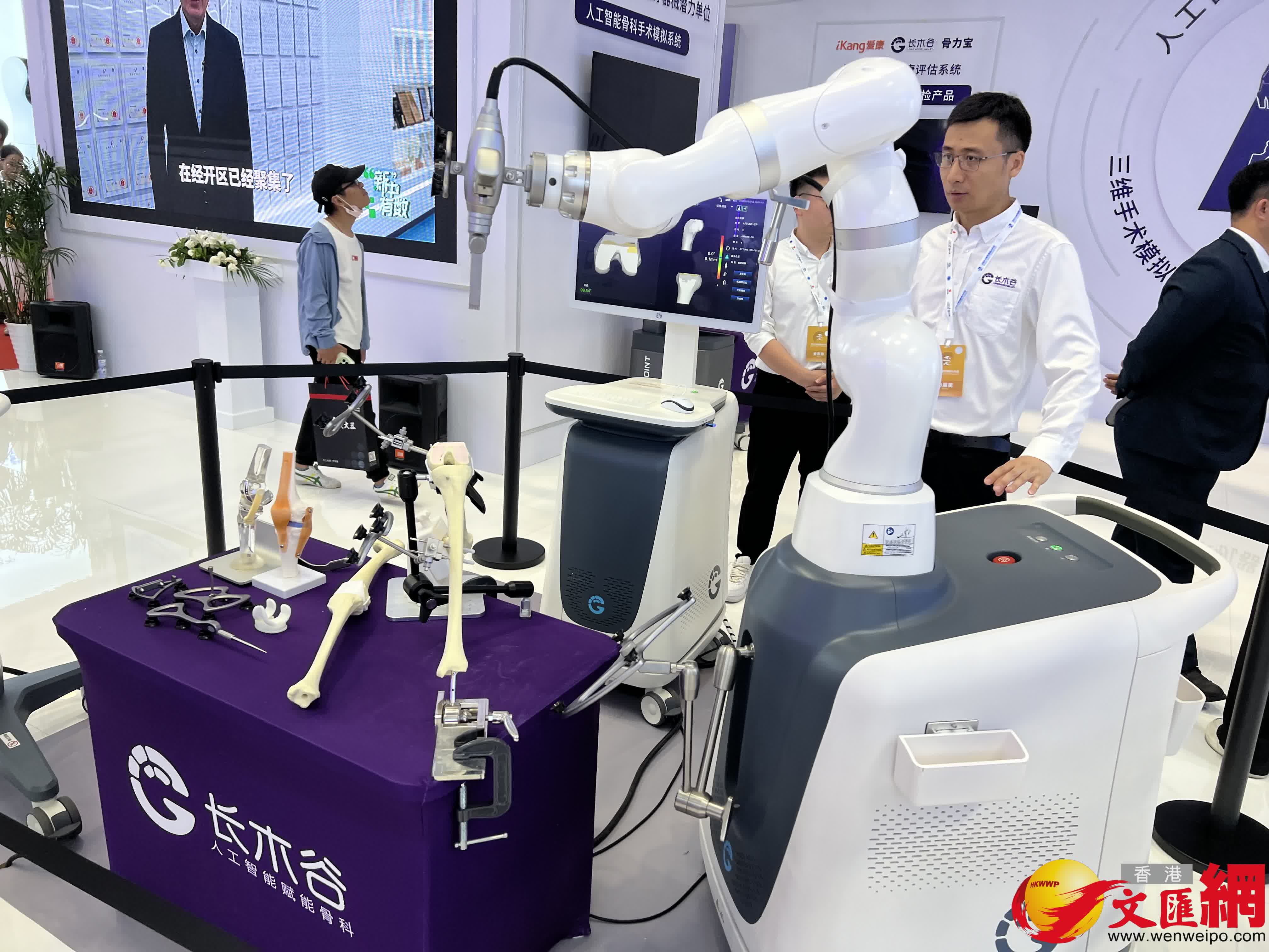 在長木谷公司的展台上,機械臂正在演示如何輔助醫生做截骨手術。這款自主研發的全球首款搭載人工智能深度學習技術的AI+ROBOT骨科手術機器人ROPA,手術控制精度突破毫米級別,在縮短手術時間、降低手術風險、減輕患者痛苦等方面均有突破。長木谷董事長張逸凌介紹,ROPA搭載了先進的人工智能深度學習技術,擁有了骨科專家的「超級大腦」。在患者開展手術前,ROPA根據患者CT就能幫醫生在5-10分鐘內給出一套個體化的三維手術方案。ROPA還擁有亞毫米級的精準光學定位系統,它就像「數智眼」,可實時監測並追蹤患者術中體位的變化,幫醫生突破傳統手術的視野局限、操作盲區等瓶頸。