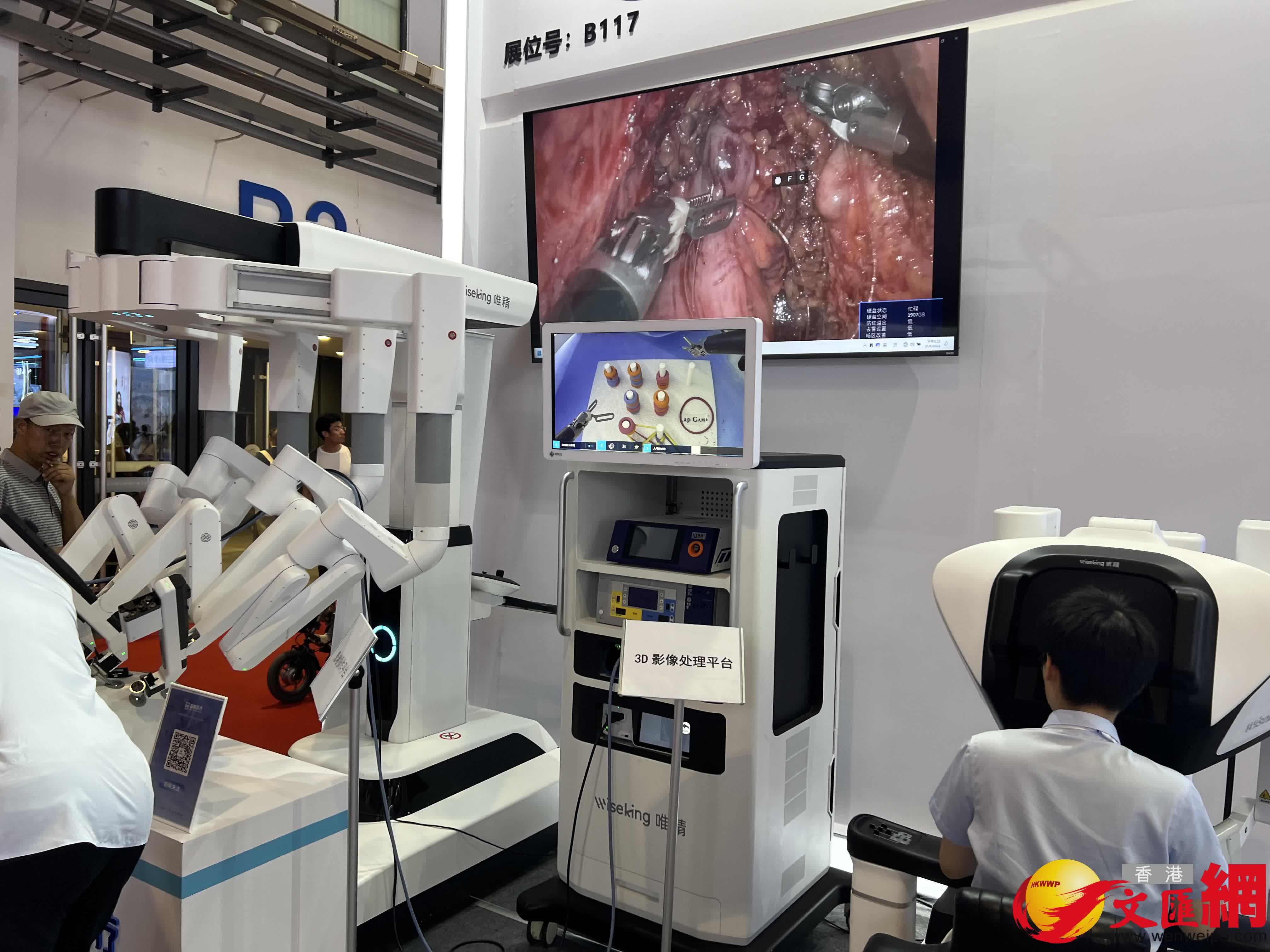唯精醫療機器人有限公司展示了自主研發的多孔手術機器人、單孔手術機器人、微創手術器械等多款產品。操作者只要坐操控台前,就能通過觀看儀器上的3D高清放大屏進行手術,機器人系統會精準地執行指令,其機械臂操控手術器械精確無誤地完成切口定位、病竈剝除、精細縫合等一系列複雜操作,通過2厘米左右的創口,就能實現0.1毫米精度的手術操作。展位負責人陳曉雯介紹,機器人操作的內窺鏡可八方向任意旋轉,視野範圍遠超以往,並且機械臂操作的手術器材不僅可以抵達腹腔中的任何位置,還免除了不慎碰撞到器官的風險。「藉助5G技術,手術過程中的延遲率不足200毫秒,跨洋手術基本實現了遠程同步操作。」