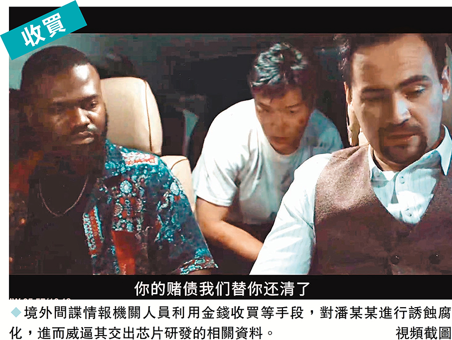 一天,某市安全機關截獲一封來自境外的秘密情報。情報顯示,M國間諜已潛入該市,並策反了一家科技公司的科研人員,妄圖竊取芯片研發的絕密資料。經過網絡追蹤並綜合篩查,安全機關發現這家公司芯片研發組的高級研究人員潘某某存在重大嫌疑。原來,潘某某此前曾在出國留學期間因貪慾欠下巨額賭債,因此被境外間諜情報機關列為重點拉攏策反對象。在安全機關的持續追蹤和深入調查下,發現潘某某在被境外間諜情報機關人員通過金錢收買、提供幫助,以及威逼利誘等手段誘蝕腐化之後,沉底淪陷並成為為境外情報機關搜集中國絕密情報的棋子。