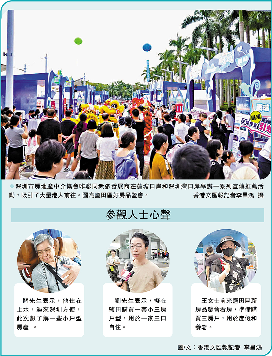 在深圳市住房和建設局、市口岸辦支持下,深圳市房地產中介協會昨聯合多家發展商,在蓮塘口岸和深圳灣口岸舉辦以「活力深圳 宜居未來」主題房地產宣傳推薦活動。活動中有66個樓盤參展,吸引大量香港人前往睇樓及購房。有個別樓盤更即場獲40組港人購買單位。香港文匯報記者在現場訪問多位參觀人士,他們直言隨着深圳購物便利和價格便宜,深圳樓價經過調整較香港物業具更高性價比,故計劃在深圳購房養老。