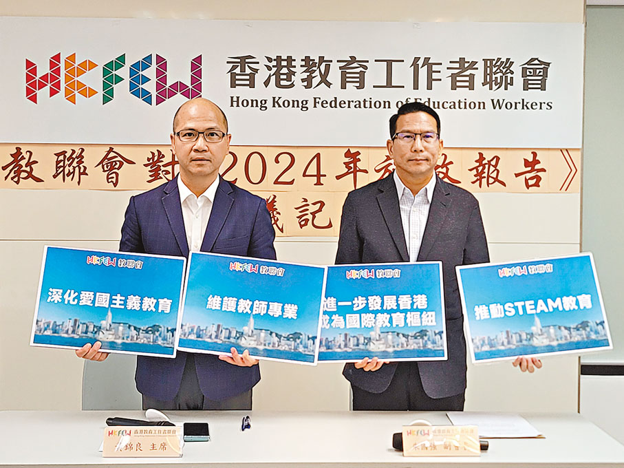 教聯會主席黃錦良、副會長朱國強昨日舉行記者會,就施政報告諮詢提出建議,涵蓋深化愛國主義教育、維護教師專業、進一步發展香港成為國際教育樞紐、推動STEAM教育、推動職業專才教育、應對學齡人口下跌、激活人口與家庭友善、正向教育與精神健康,以及提升中小學設施九大範疇(見表),希望從大局和長遠需要謀劃香港的教育發展。