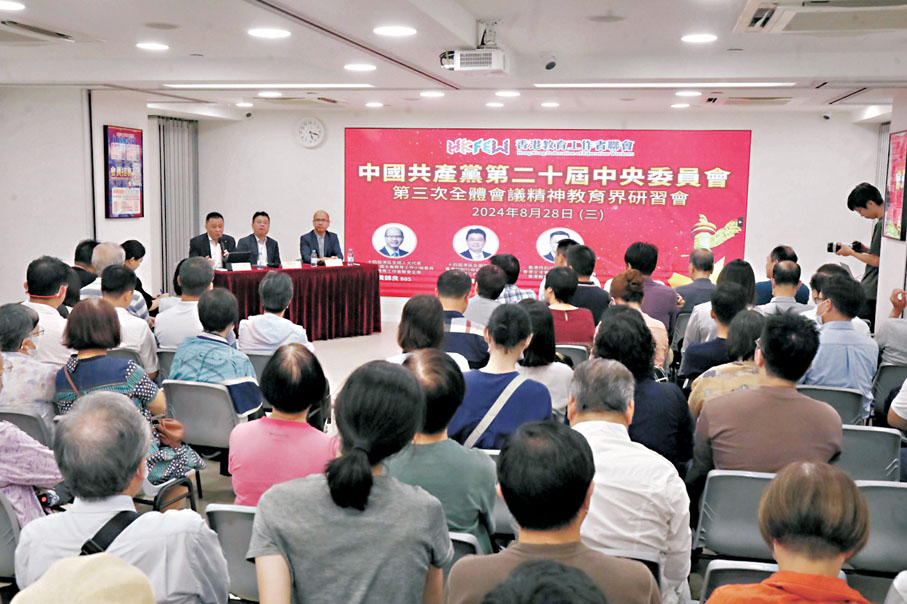 香港文匯訊(記者 胡恬恬)香港教育工作者聯會昨日舉辦中共二十屆三中全會精神教育界研習會,近百名校長、教師等教育工作者出席研習會。教聯會主席黃錦良、會長劉智鵬、副會長鄧飛出席研習會擔任講者,分享二十屆三中全會精神、對香港的指引、對教育工作者的啟示和教育界未來發展的方向。他們表示,香港未來要繼續打造教育樞紐,發揮香港學術界的國際化優勢,打造國際學術交流中心,並逐步完善與「一國兩制」相適應的教育體系,開展愛國主義教育,重點發展航天科技相關課程等。