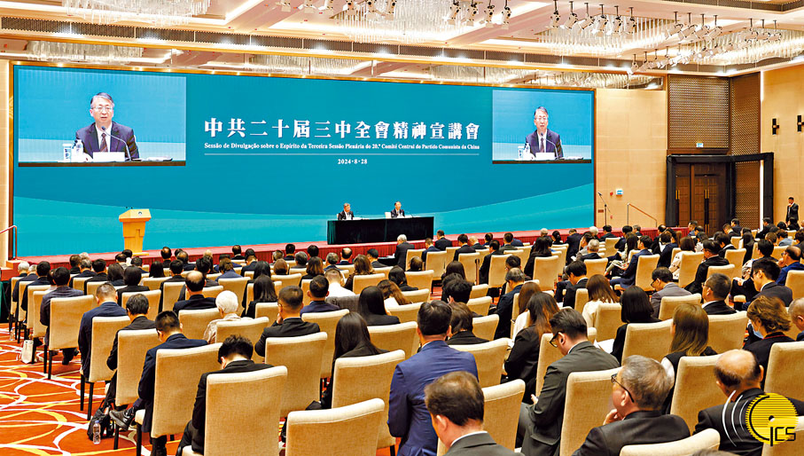 應澳門特區政府請求,經中央批准,中央港澳工作辦公室、國務院港澳事務辦公室邀請中央宣講團成員、全國人大憲法和法律委員會副主任委員、全國人大常委會法制工作委員會主任沈春耀,中央宣講團成員、商務部黨組書記、部長王文濤來到澳門,向澳門各界宣講中共二十屆三中全會精神。◆大公文匯全媒體記者龔學鳴 澳門報道