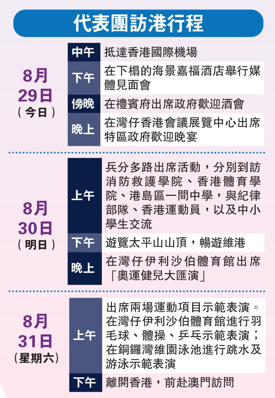 他們明日會分組出席活動。消息指,他們會到位於沙田的香港體育學院、港島一間中學及消防救護學院,同本港運動員、中小學生及紀律部隊等交流,之後會到山頂欣賞維港景色,晚上出席在伊利沙伯體育館舉行的大匯演。到星期六早上,代表團將兵分兩路出席運動項目示範,一場在伊利沙伯體育館,示範羽毛球、體操和乒乓球,另一場在維園游泳池示範跳水和游泳。