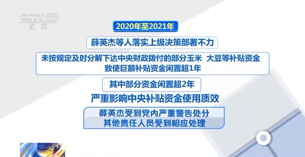 2020年至2021年,薛英傑等人落實上級決策部署不力,未按規定及時分解下達中央財政撥付的部分玉米、大豆等補貼資金,致使巨額補貼資金閑置超1年,其中部分資金閑置超2年,嚴重影響中央補貼資金使用質效。薛英傑受到黨內嚴重警告處分,其他責任人員受到相應處理。