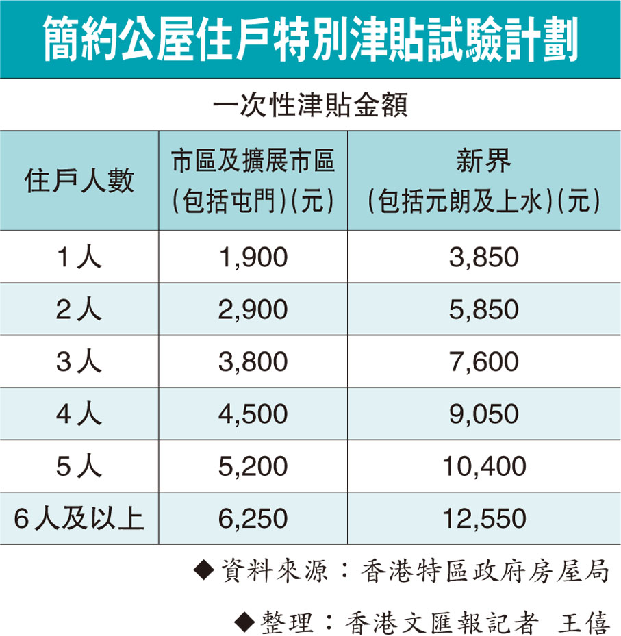 香港文匯報訊(記者 王僖)為配合快將陸續落成入伙的「簡約公屋」,香港特區政府房屋局昨日公布推出「簡約公屋住戶特別津貼試驗計劃」(「試驗計劃」),為簡約公屋住戶提供一次性特別津貼,減輕他們於搬遷和適應新居住環境和社區時的開支壓力,例如孩子轉校、添置傢具電器、重新建立社區網絡等,協助他們更快投入新社區。津貼金額視乎住戶同住的家人數目和入住項目的地區而定,介乎1,900元至12,550元(見表),不設用途限制,讓住戶更靈活地應付各自需要。房屋局已成功向扶貧委員會申請由關愛基金撥款8,988萬元推行計劃,預計約21,000戶受惠。