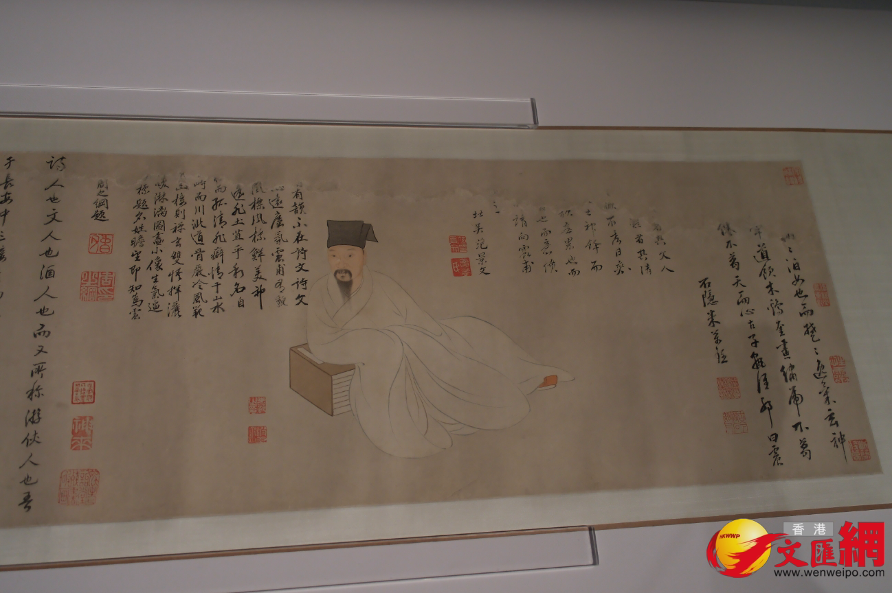 畫中人物倚書斜坐,別無他景,吻合主人公文雅高潔的身份個性。畫面空白處有米萬鍾、范景文、周之綱、王思任四位晚明文人題贊。