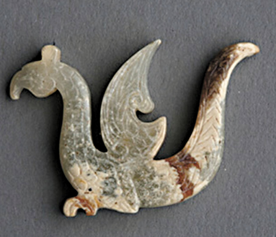 該枚玉飛鳳為白玉,受沁呈白色、微透明,鳳額處有一紅色圓斑,鳳作振翅欲飛狀,冠、翅及尾採用邊緣切割成形,伴有一小孔上下貫穿。 玉飛鳳正反兩面均陰刻極淺、極細的羽片,內為羽紋,翅及尾的邊緣陰刻斜線紋。