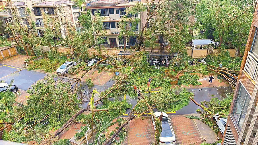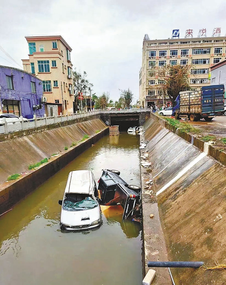 經歷超強颱風「摩羯」數個小時的橫掃,7日清晨,海口街上滿是倒伏的樹木、廣告牌,共享單車東倒西歪,偶爾還有被吹翻的小汽車。在紅城湖路,中央隔離帶兩排棕櫚樹被齊齊「剃頭」,兩邊行道樹或整棵被連根拔起,或被風從中間扭斷。倒下的樹木、路燈和交通指示牌將道路擋住了大半,汽車和行人在其中艱難「尋路」。在龍昆南路一家便利店,大風把玻璃門全部破壞,貨架吹倒,貨品散落一地。
