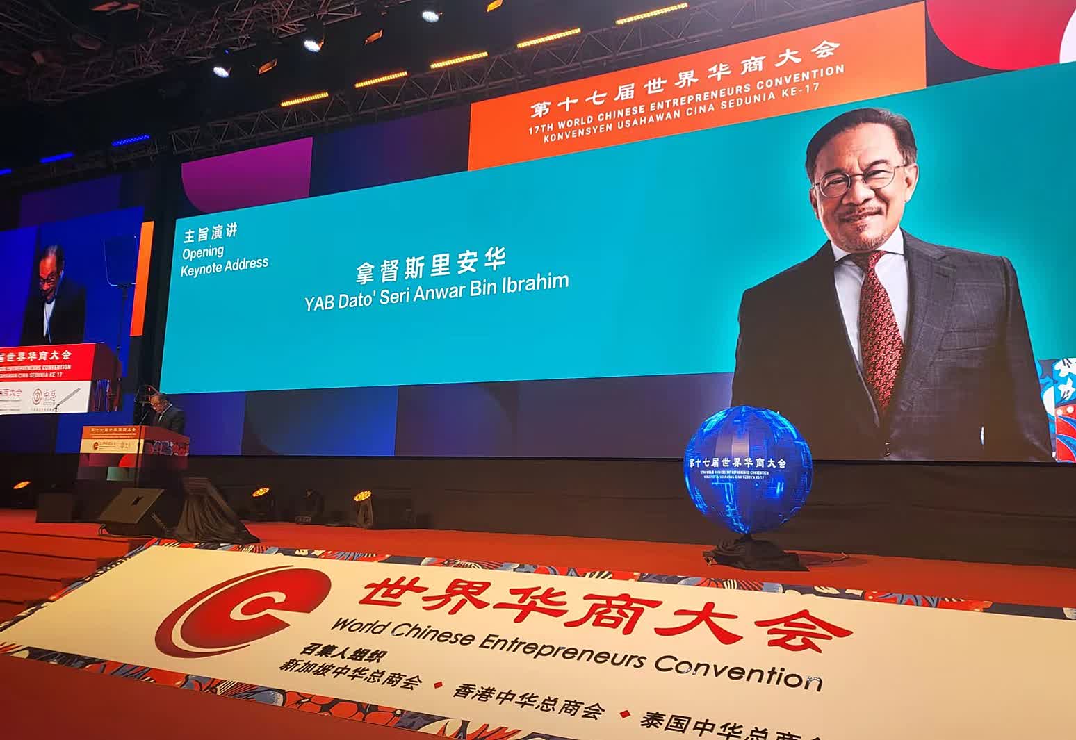 10日上午,馬來西亞首相拿督斯里安華在第十七屆世界華商大會開幕式上發表主旨演講時,在現場大秀華語。當他以「我們都是一家人」概括大馬各族群時,現場迎來一片掌聲。安華感謝華商在大馬經濟上扮演的角色和貢獻,並希望國內企業共同合作,一同邁進。