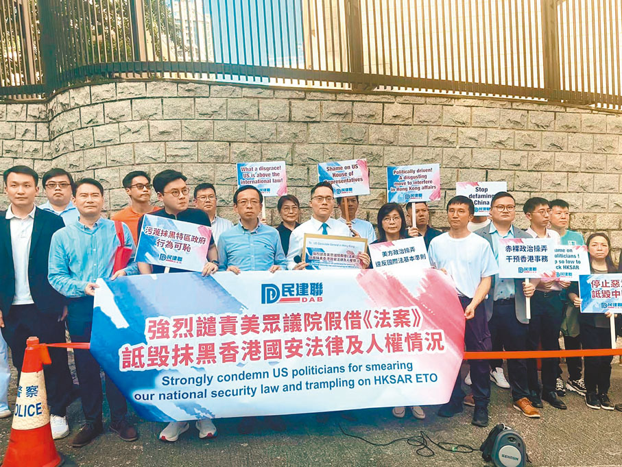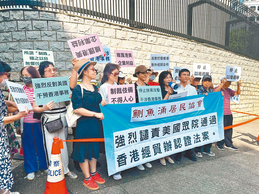 香港文匯報訊(記者 胡恬恬)美國國會眾議院通過所謂《香港經濟貿易辦事處認證法案》,香港有多個團體昨日到位於中環的美國駐港澳總領館前抗議,譴責美國歪曲事實,抹黑香港,打壓香港對外經貿合作。
