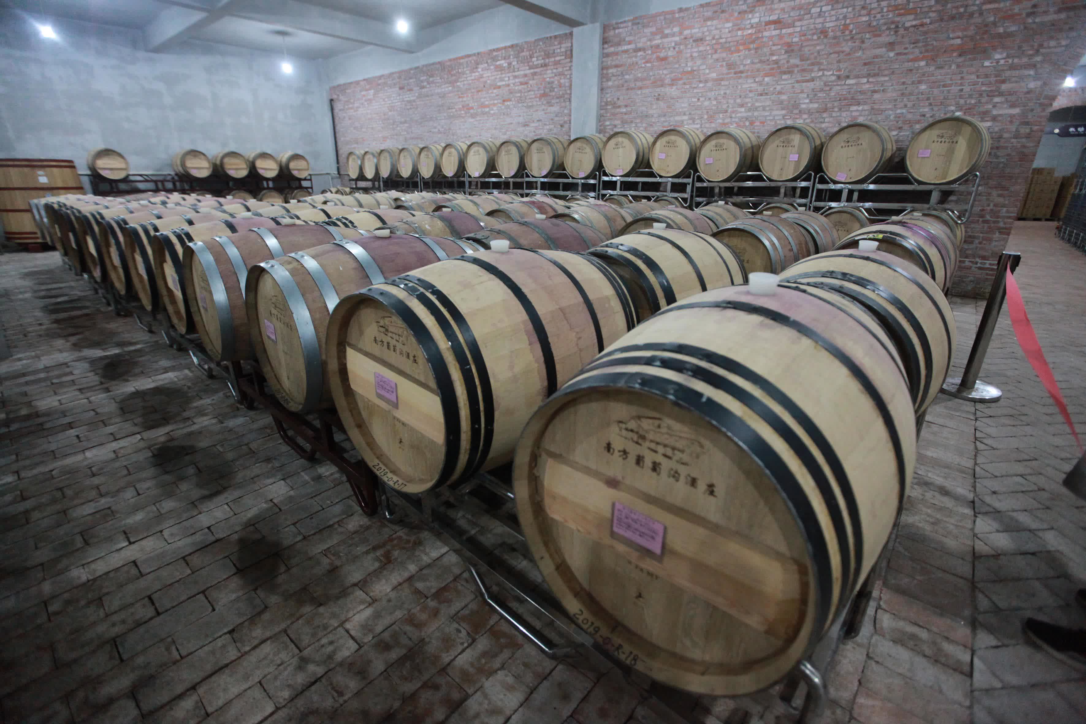在南方葡萄溝酒莊的酒窖中,存貯大量裝滿紅酒的大木桶,走進去,一股酒香撲面而來。工作人員介紹,這些酒存放達一年以上,有些兩年多了。