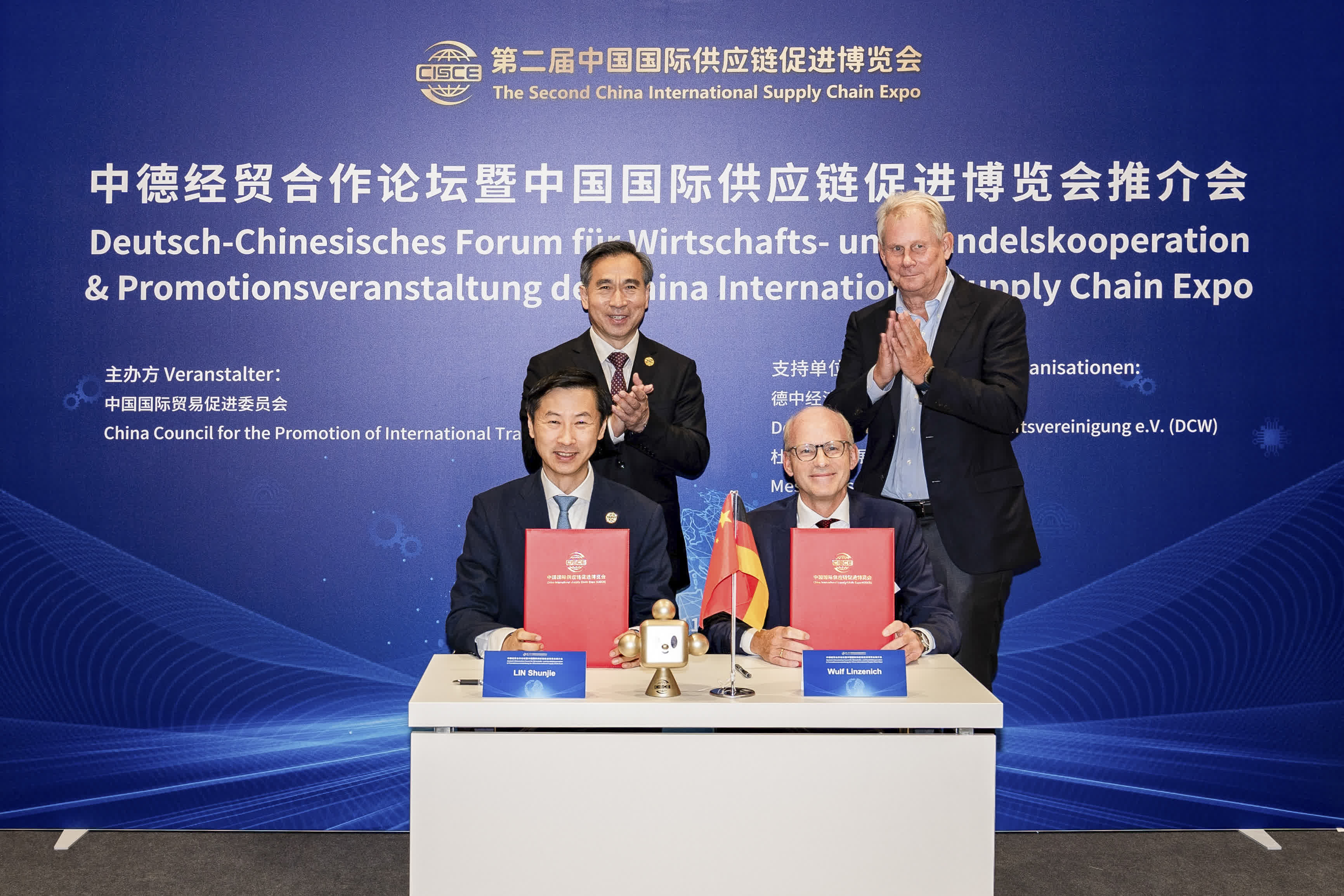 推介會期間,中德企業代表分享產業鏈供應鏈合作案例,中展集團推介第二屆鏈博會,並與德中經濟聯合會簽署相關協議。近130位中德兩國企業代表出席推介會。