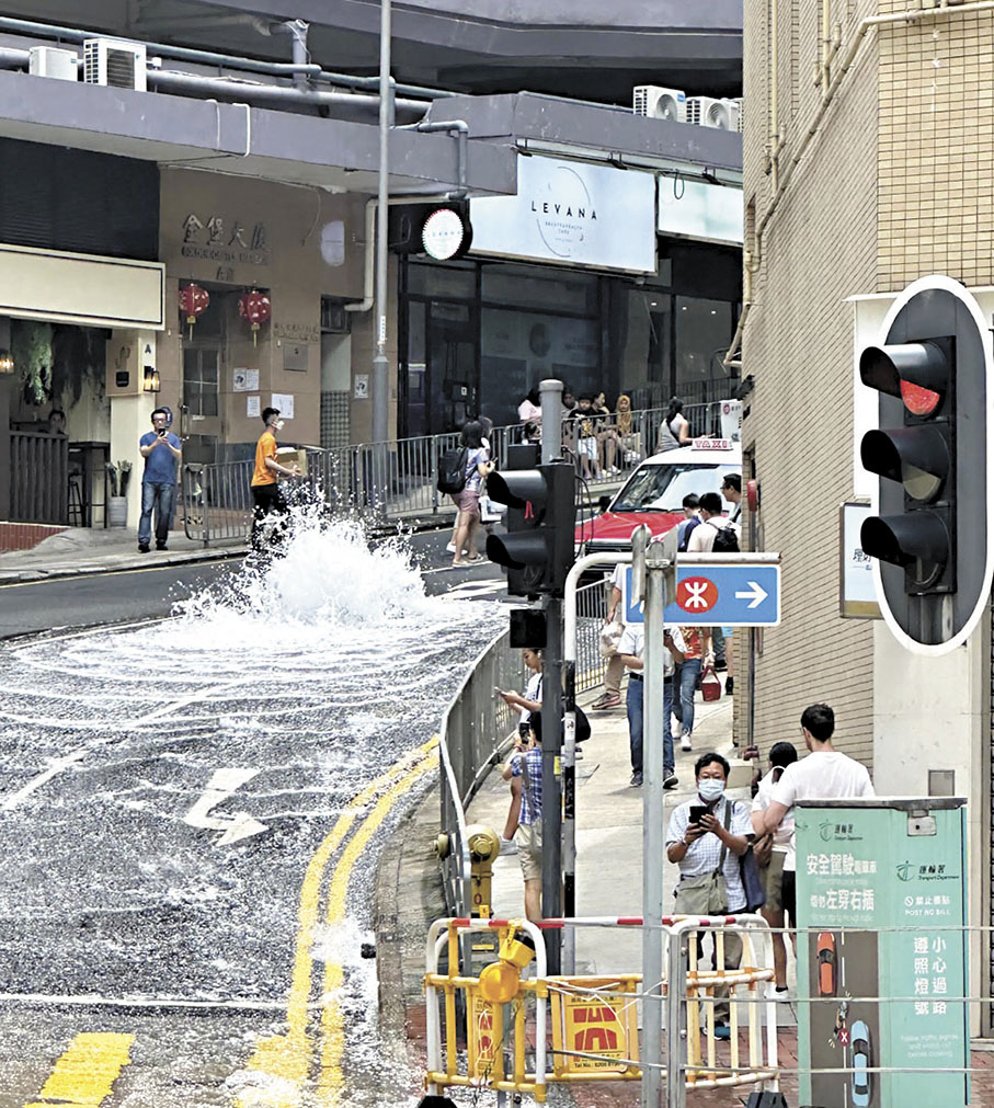 香港文匯報訊 昨日上午9時許,北角炮台山道2號馬路位置有水管爆裂,噴出水柱最高達1.8米。香港文匯報記者現場所見,涉事路段斜路下方行人過路處水深近半呎,有想過馬路的市民見到此景只得「望洋興嘆」,也有不少人涉水而行。有警員在現場指揮交通,並協助清理路面磚石等。
