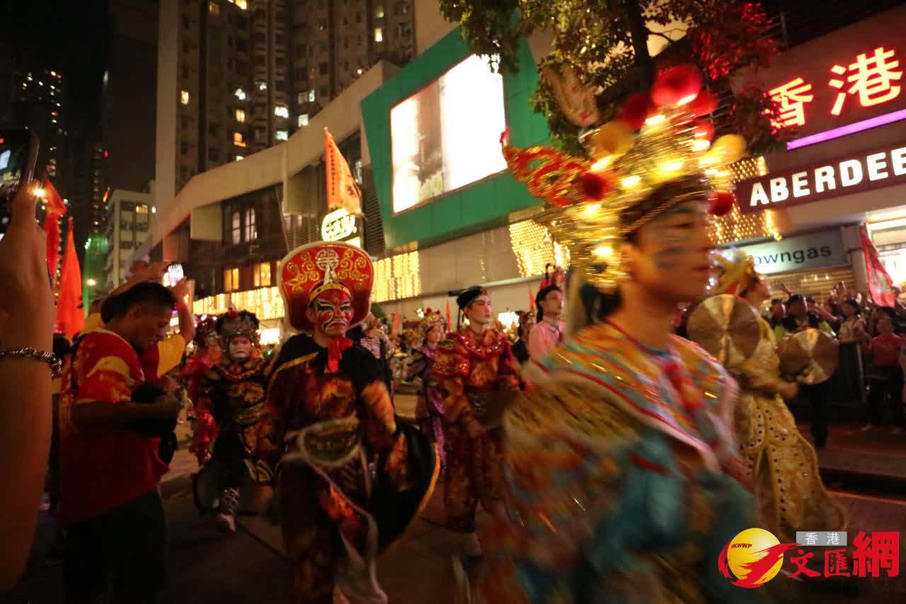香港文匯報訊(記者 子京)「火龍飛舞賀中秋 萬眾歡騰迎國慶『香港仔中秋火龍盛會』」今晚8時在香港仔中心盛大舉行。今年共出動一條火龍及多條熒光龍,整個巡遊隊伍多達200人,包括出動75名健兒舞動火龍,75名學生舞動熒光龍,以及75名學生手持燈籠引領巡遊隊伍。今年巡遊隊伍更首次加入來自深圳福田的英歌舞隊,盛裝打扮歡快起舞,氣氛熱鬧非凡,吸引大批市民沿途圍觀。