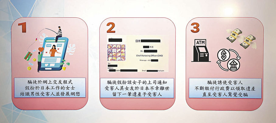 有詐騙集團將「網上情緣」及「天降橫財」騙術二合一,假扮在日本工作的獨身港女,在網上交友程式狩獵港男玩網戀,以甜言蜜語和假圖片令港男深陷情網,但情到濃時港女「意外身故」,騙徒再扮港女的日本上司聯絡港男,訛稱受港女委託將一筆價值數十萬港元的遺產交給受害港男,但要先支付行政費,騙徒收取行政費後即失聯。9個月間,共有99名港男中伏,包括工程師和醫生等專業人士,共被騙2,000萬港元。警方鎖定詐騙集團在港招攬的洗黑錢集團,前日(16日)採取代號「銀壁」的行動拘捕11人,包括4名詐騙集團骨幹成員。 ●香港文匯報記者 蕭景源
