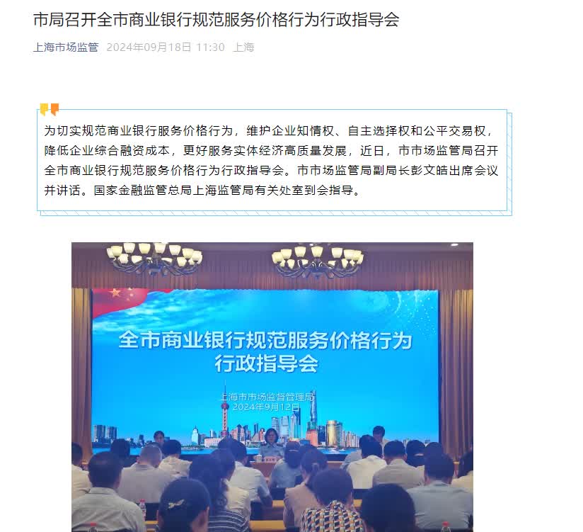 上海市場監管微信公眾號今日(18日)發布消息,近日,上海市市場監管局召開全市商業銀行規範服務價格行為行政指導會,並現場發放了《商業銀行規範服務價格行為合規提示函》。