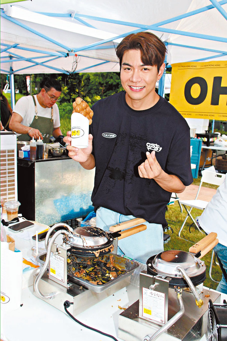 羅天宇昨日同時為市集擺攤位賣雞蛋仔,原來他是第一次在香港公開發售,所以心情有點緊張,他說:「因為要調整回適合香港人的口味,發現內地人喜歡原味,香港人就較喜歡朱古力味。」今年天宇也試水溫售賣月餅,他表示銷情不俗,說:「我們是收了訂單後才做月餅,所以都有賺少少。(可以跟黎諾懿的月餅品牌競爭?)不敢,我們只是小本形式,諾懿的是大品牌。」