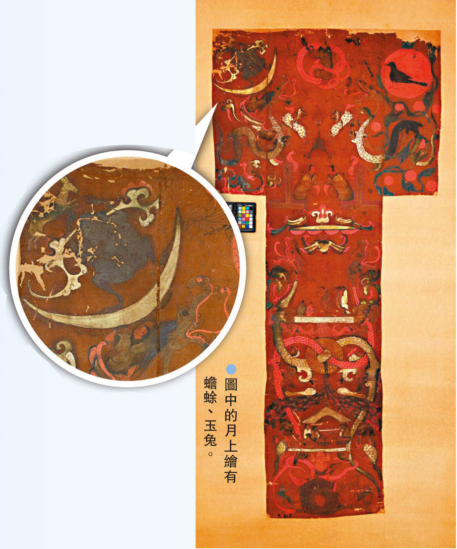 湖南博物院院長段曉明介紹,T形帛畫用筆墨和重彩繪製,從上至下分為天上、人間和地下三部分。天上部分是「T形」上端最開闊的地方,頂端正中間坐着人身蛇尾的燭龍,其左側掛有一輪彎月,月上繪有蟾蜍、玉兔,月下有一位托月女神。