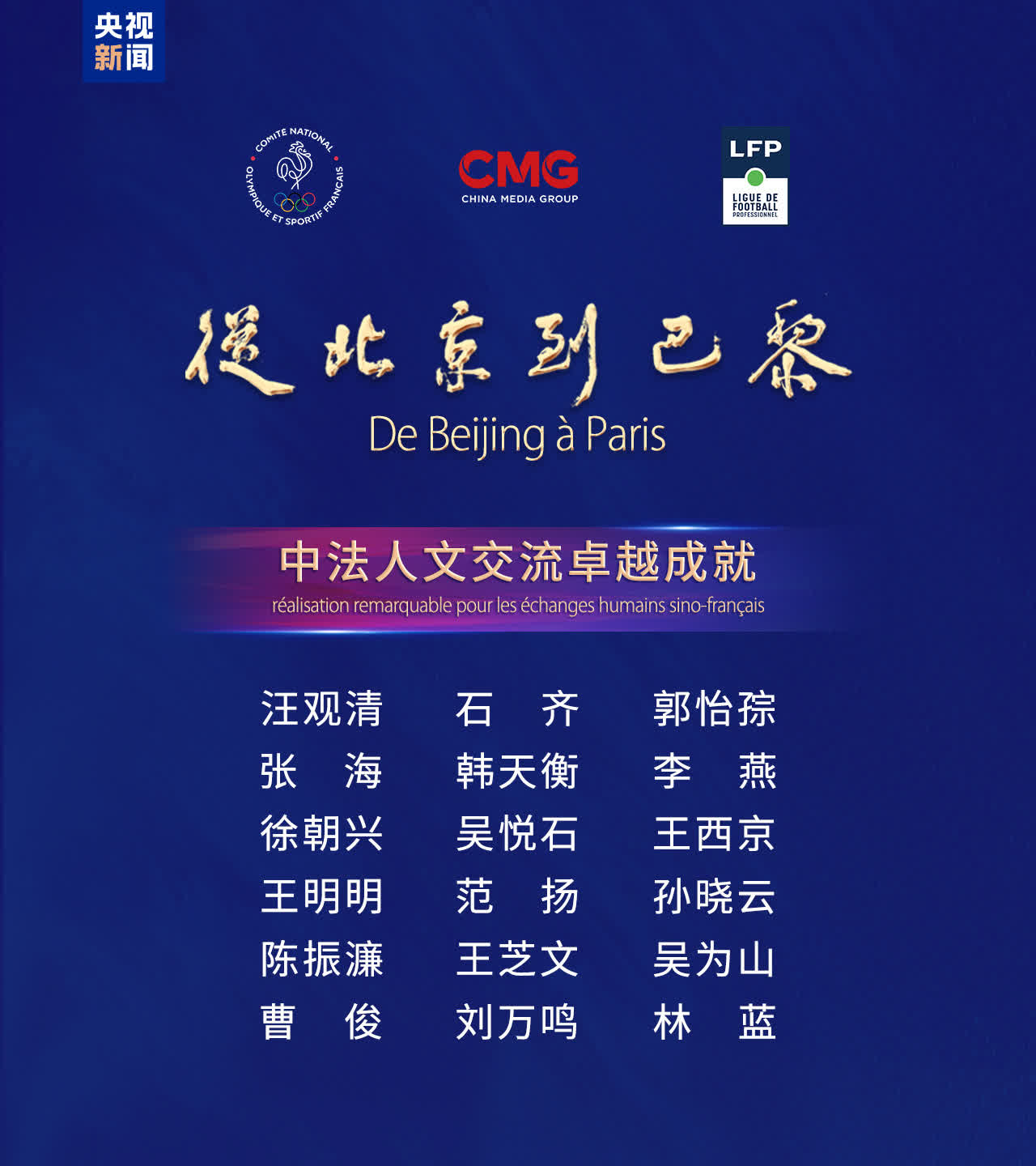 今年5月,由法國國家奧林匹克和體育委員會、中國中央廣播電視總台、法國職業足球聯盟共同主辦的「從北京到巴黎——中法藝術家奧林匹克行」中國藝術大展在法國巴黎舉辦,100多位中國當代傑出藝術家的200餘件精品佳作帶給法國民眾一場別開生面的文化之旅。活動現場頒發了「從北京到巴黎——中法人文交流」系列獎項榮譽證書及獎盃。