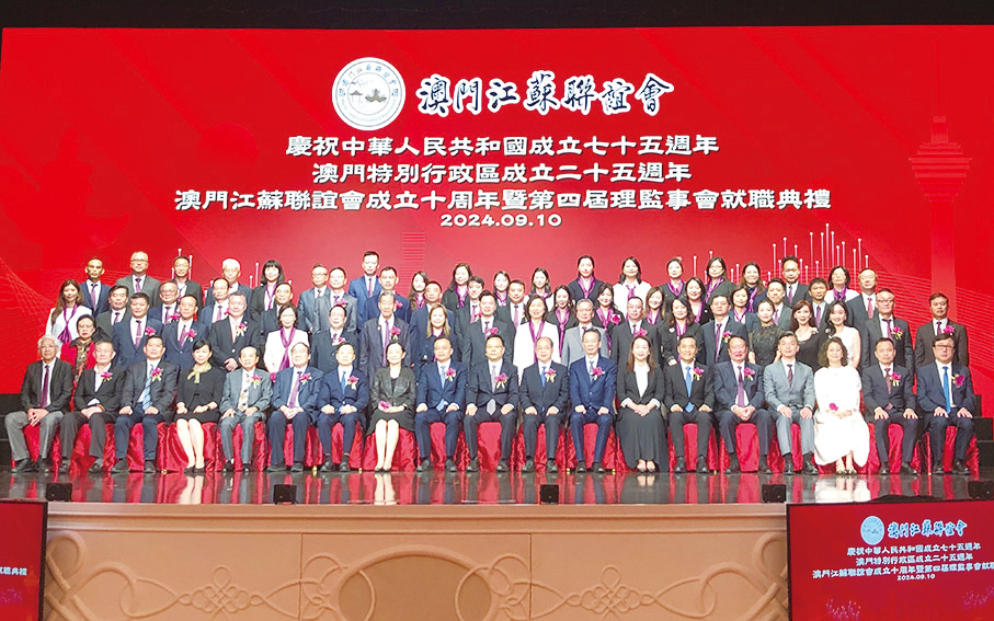 澳門江蘇聯誼會日前假澳門永利皇宮宴會廳舉行創會十周年暨第四屆理監事就職典禮。新一屆理監事在江蘇省委統戰部常務副部長顧萬峰的監誓下,由會長何嘉慈、理事長岑定賢和監事長陳志玲帶領宣誓就職。