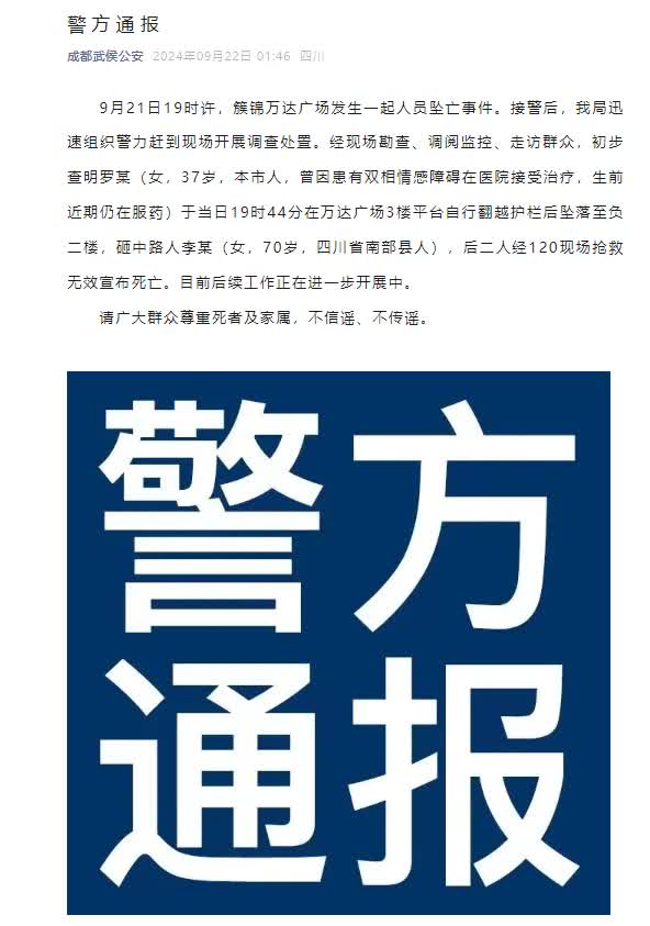 經現場勘查、調閱監控、走訪群眾,初步查明羅某(女,37歲,成都市人,曾因患有雙相情感障礙在醫院接受治療,生前近期仍在服藥)於當日19時44分在萬達廣場3樓平台自行翻越護欄後墜落至負二樓,砸中路人李某(女,70歲,四川省南部縣人),後二人經120現場搶救無效宣布死亡。