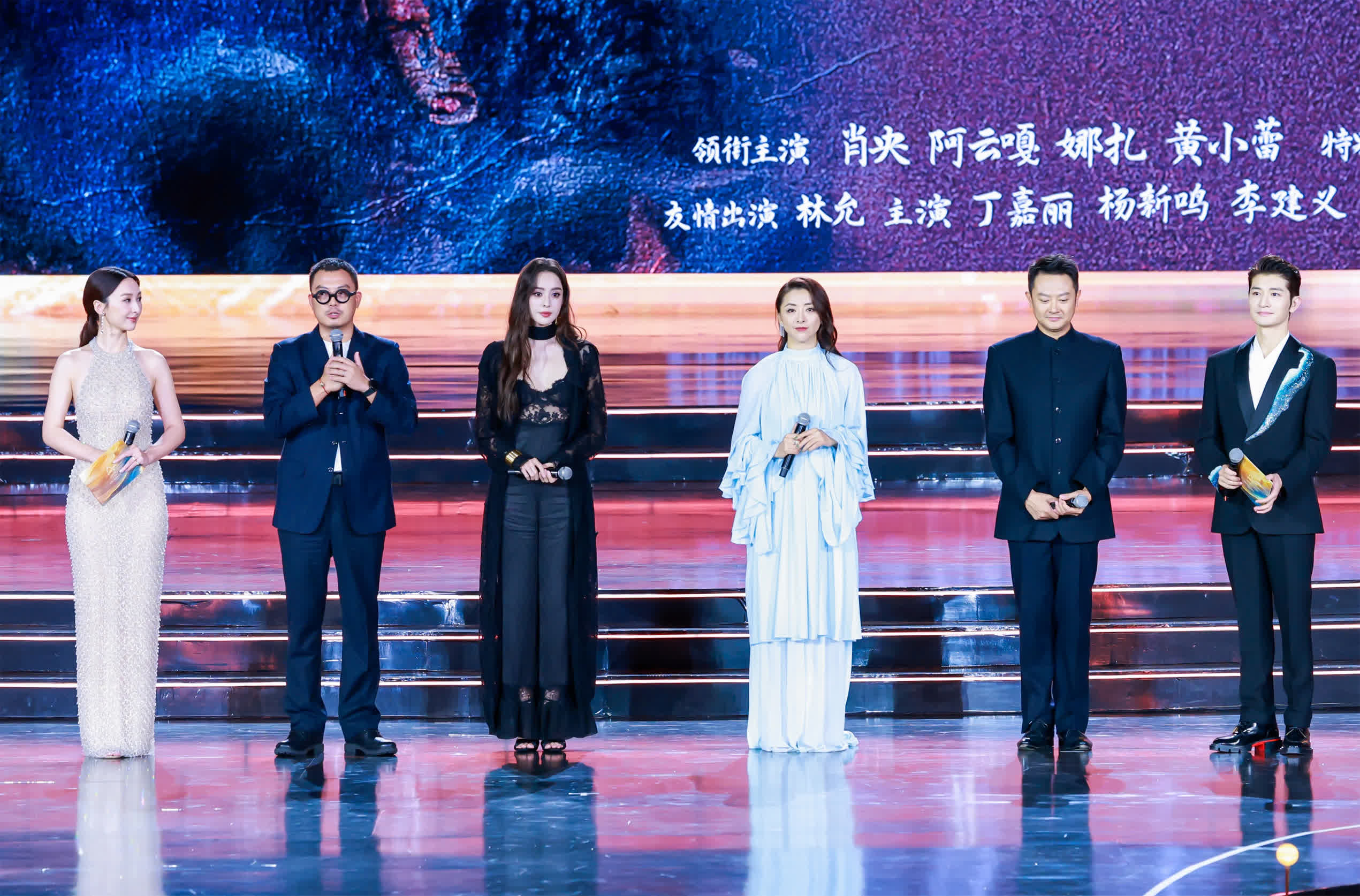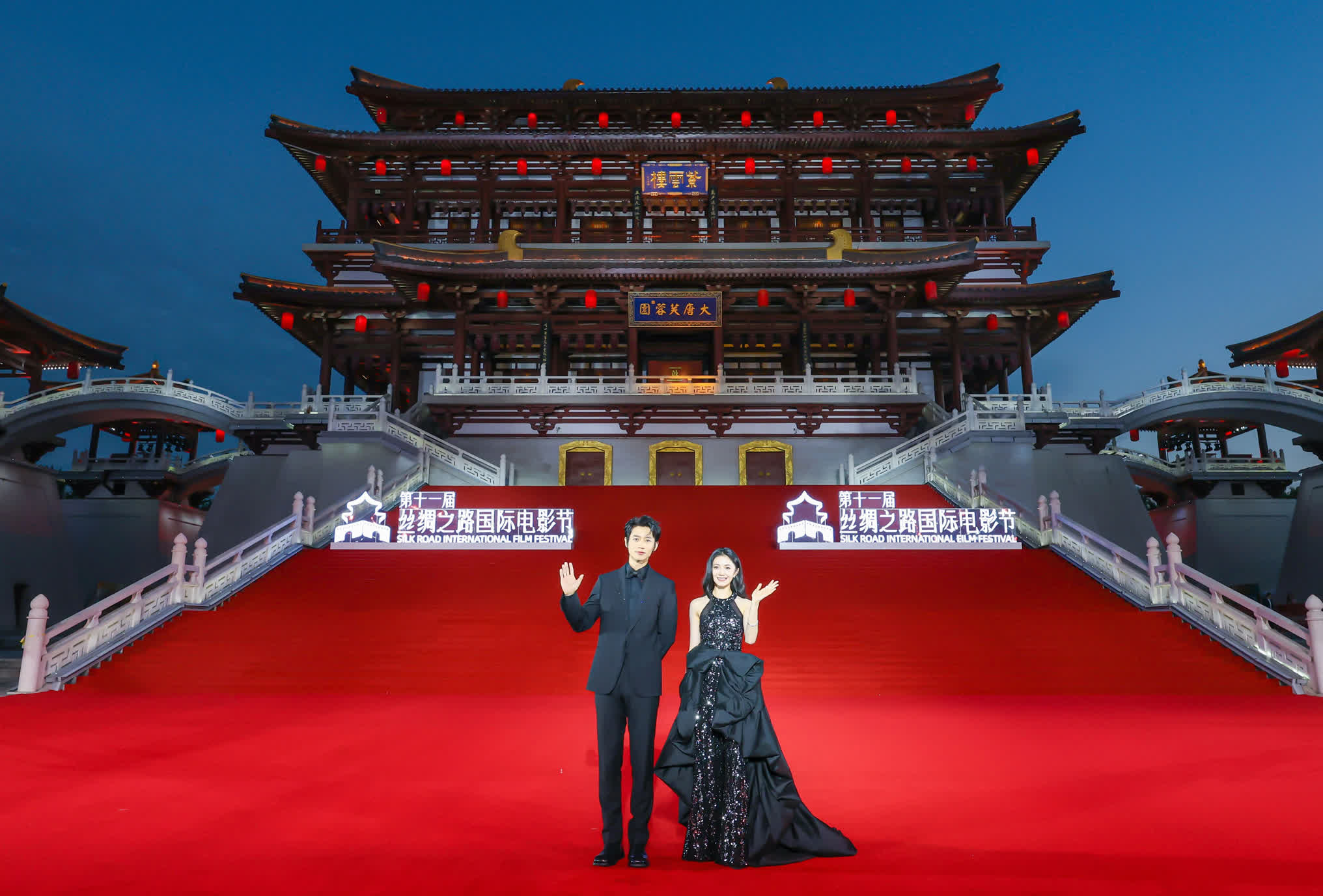 當晚古色古香的西安大唐芙蓉園星光熠熠,在彰顯着大唐盛世與芳華的紫雲樓前,甄子丹、張嘉益、閆妮、張鈞甯、苗圃、劉浩存、魏晨、劉佩琦、娜扎、黃小蕾、竇驍等影壇明星,隨着盛唐儀仗迎客禮走上紅毯。光影交錯與唐風唐韻,歷史的厚重與現代的輝煌、交相輝映、完美融合,「星光度」瞬間拉滿。