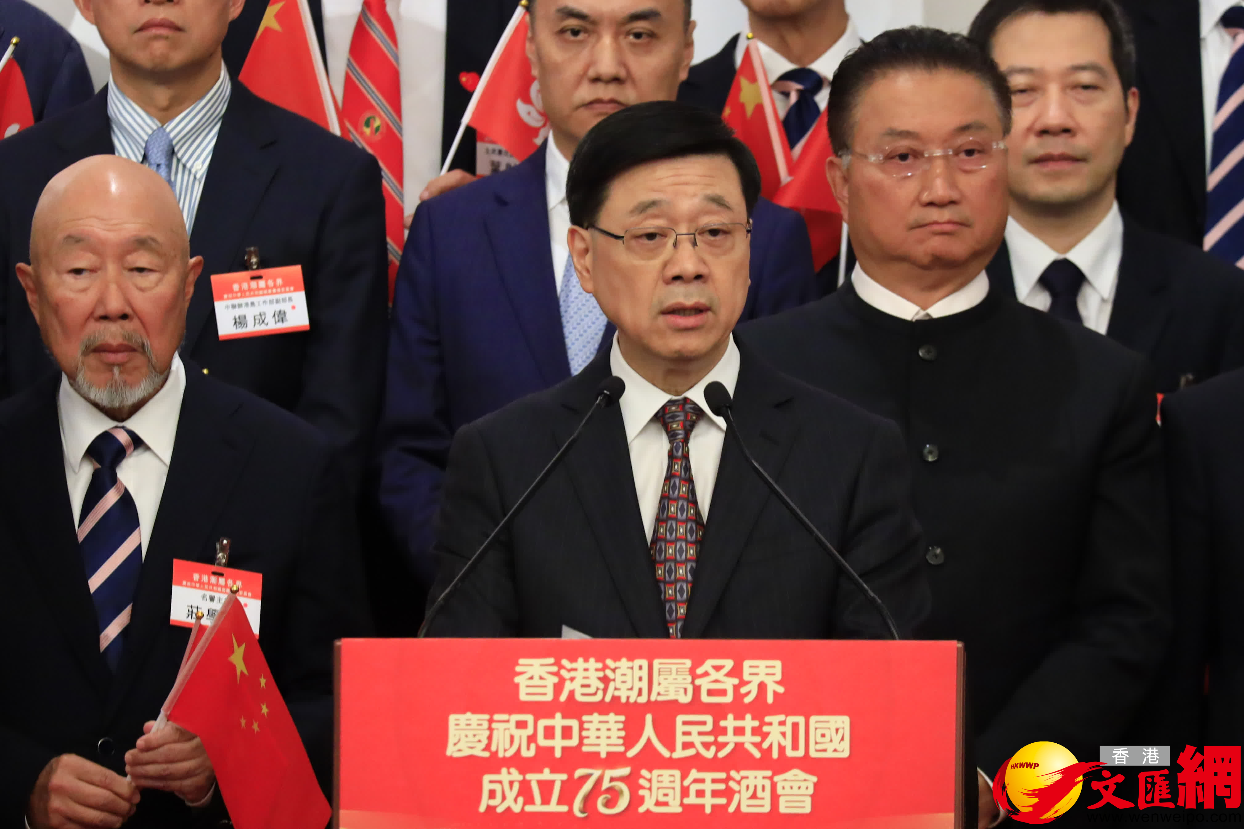 香港文匯報訊(記者 子京)香港潮屬各界慶祝中華人民共和國成立75周年國慶酒會今日(23日)在港舉行。特區行政長官李家超在酒會上致辭表示,香港正處於經濟轉型期,各界都要識變、求變,推動產業升級轉型。他希望潮屬鄉親積極善用他們的聯繫網絡,繼續在社會發揮影響力,助力香港實現高質量發展,為中華民族偉大復興全力貢獻香港力量。